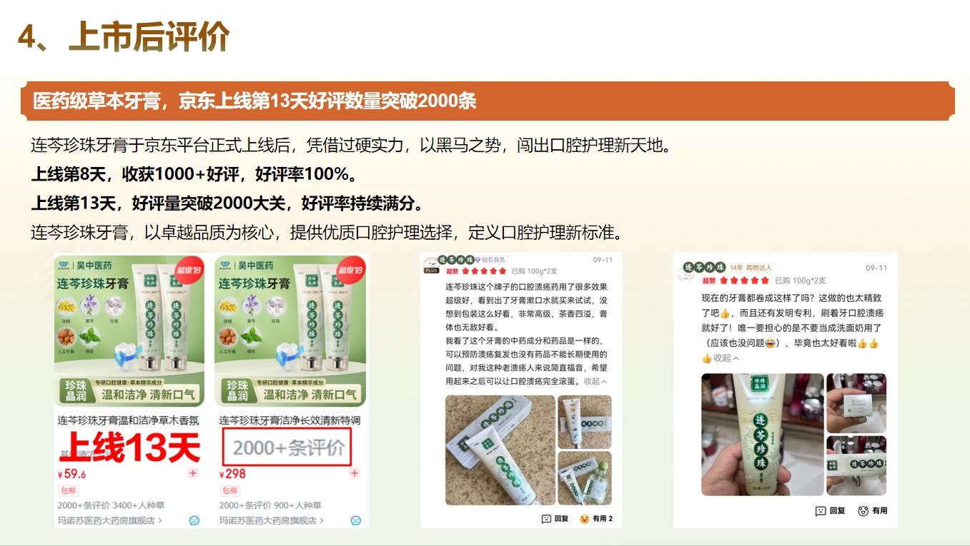 在市场表现方面,连芩珍珠牙膏自于京东平台正式上线后,便以黑马之势,闯出口腔护理新天地。上线第八天,就收获1000 + 好评,好评率达到100%;上线第十三天,好评量更是突破2000大关,好评率持续满分。许多消费者表示,连芩珍珠牙膏是一款医药级草本牙膏,使用起来十分放心。