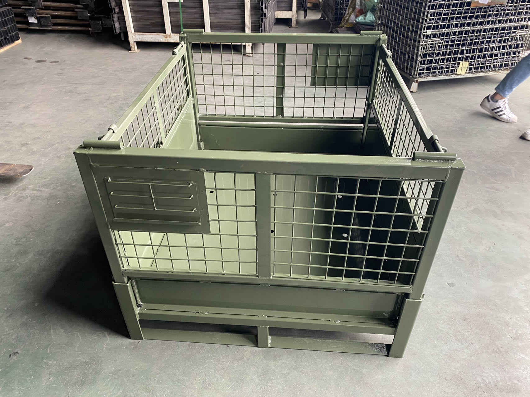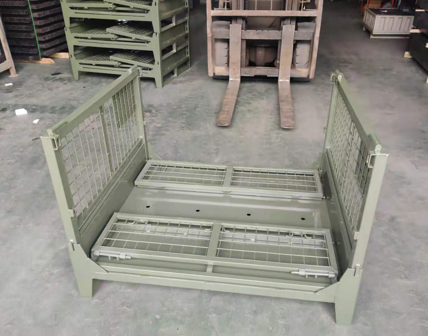 网格料箱也称为网箱或加强型仓储笼,采用方管焊接结构,和一般仓库笼相比极大提高结构强度,多层堆叠更加安全,使用寿命更长。底部采用框架式刚性结构,由钢质面板与钢质支腿焊接而成,四周采用与仓储笼相同的优质冷拔钢丝及优质型材焊接而成。网格料箱可互相堆高、多层保管,实现立体化存储,很容易形成立体存储的能力,而不需要借助于货架等设备。灵巧的开门设计使堆叠时也可方便存取货物,专用的堆叠底脚使叉车作业比较方便。这种网格料箱可折叠、可堆垛,节约物流成本和提高了仓库利用率,广泛应用于制造型加工企业、产品仓库,物流仓储中心等场合。