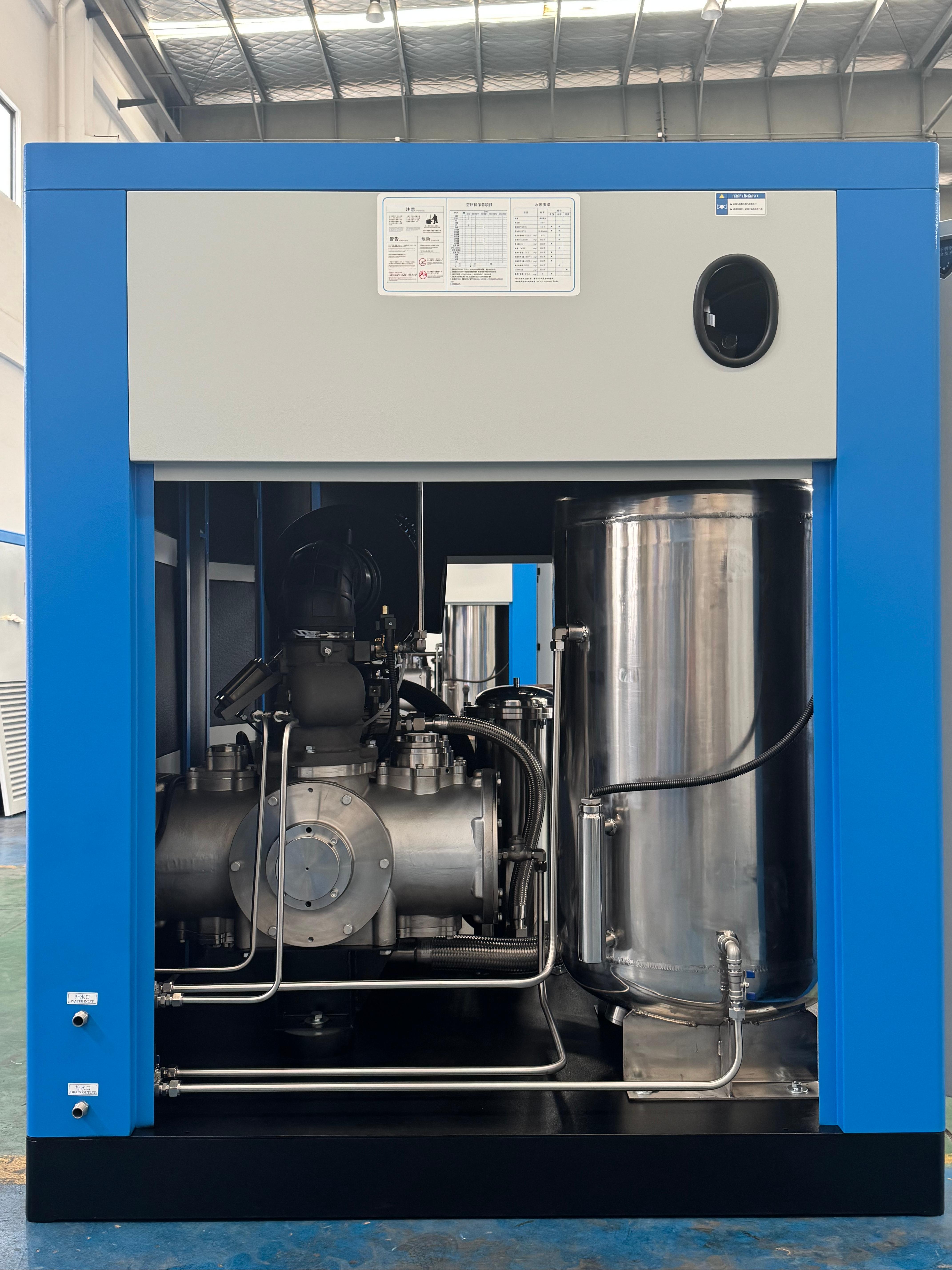 索贝克精机的无油螺杆压缩机还具有更宽的压力范围,可达2bar - 40bar,能够满足不同客户的需求。全数控智能精密加工工艺让主机运行平稳,确保低噪音、小震动及长使用寿命。相同功率的水润滑螺杆压缩机比干式无油螺杆压缩机排气量平均大10%以上。操作也更加简单方便,采用PLC智能控制,具有自动故障检测、故障预警、保养提醒、自动保护功能,可实现24小时无人值守,还可实现远程控制功能。压缩空气经过润滑水的清洗,更加洁净,可以直接用于呼吸使用,饱和压缩空气的露点低,压缩空气的含水量比普通干式螺杆空压机平均低25%以上。