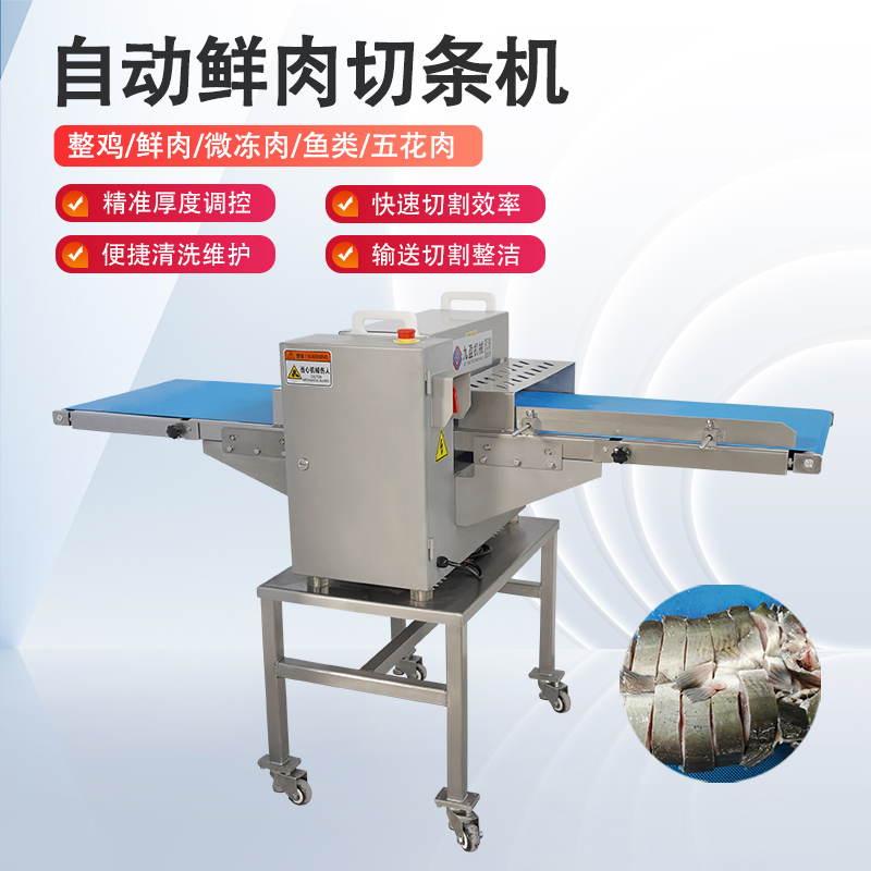 五花肉开条切块机具有精准切割的特点,能够根据不同的需求将五花肉切成合适的条块大小,保证切割的均匀性和一致性,大大提高了加工效率和产品质量。切肉条机则操作简便,通过先进的技术和合理的设计,能够快速将肉类切成粗细均匀的肉条,减少人工操作的误差和劳动强度。鲜肉开条切块机采用优质的材料和精湛的工艺制造,具有良好的耐用性和稳定性,能够适应长时间、高强度的工作环境,保障鲜肉加工的连续性和高效性。