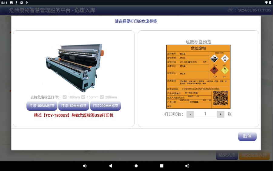 产品质量和性能方面,具有以下特点:其一,智能入库功能强大,提供多种入库选项,还支持入库暂存,方便企业对危废进行管理。其二,具备三种标签打印功能,支持 100mm、150mm、200mm 危废打印,满足不同场景的需求。其三,扫码出库功能便捷,扫码即可自动出库,提高了工作效率。其四,能够进行数据统计分析,统计各类危废、固废台账数据,为企业的管理决策提供数据支持。其五,可实现数据上传,将危废数据上传各省环保管理平台,确保企业合规。其六,配备视频监控功能,可实时查看危废管理相关视频,增强管理的安全性。其七,支持多种通讯方式,如 RS485、有线、WIFI、4G 无线等接入手段,能灵活适应现场网络情况。