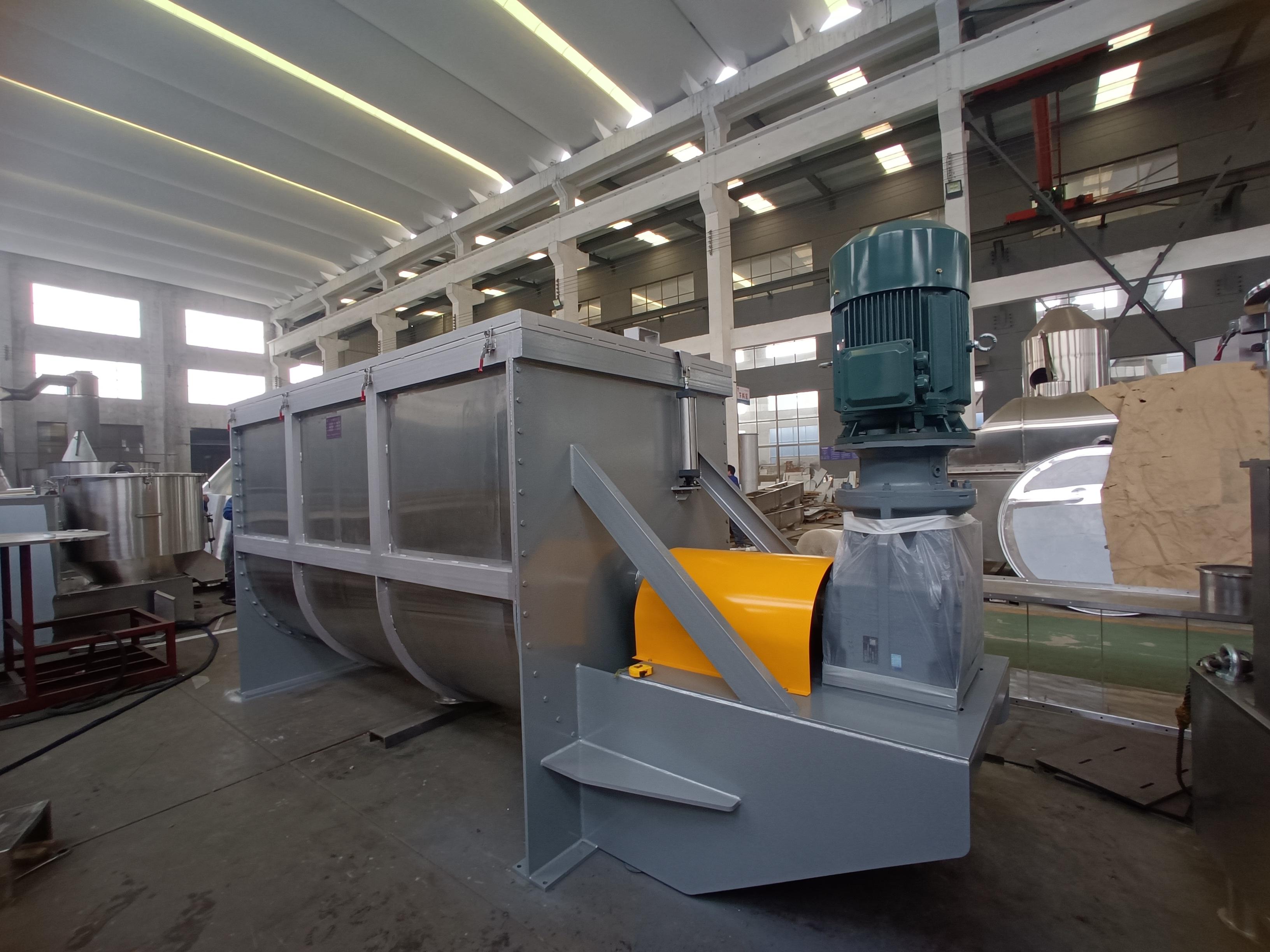 公司的鸡粉生产线具有诸多优势。它采用整合粉碎、混合、制粒、干燥、冷却、分筛、加香工段的形式,既功能明确,又能有机结合,统筹运转,达到自动化工艺流水作业。该生产线的核心部分——干燥系统,采用分段加热的方式,预干燥段采用高压低风量风机,使较湿的鸡精颖粒能完全流化;干燥段采用低压高风量的风机,单位时间内带走水份多,干燥均匀;冷却段采用高风量风机,能迅速带走热量,降低产品温度,既达到水分控制的要求,又方便后续包装工艺。干燥介质循环系统中,鼓风机、加热器、进风管采用不锈钢制作,避免产品被污染的可能。干燥主机的上下床体之间采用快开式结构,改变了传统采用螺栓固定连接的形式,方便系统彻底清洗。铺料床板的孔型采用组合式结构,前段采用鸭舌形式,使物料能畅通的往前走动而不产生漏料现象;中后段采用直孔,热风的穿透率更高,干燥过程的热交换更充分。下床体采用整块厚板满焊制作,不锈钢无缝钢管支撑,床体结构更坚固,使用寿命长。下床体内部不锈钢满焊抛光,避免清洗时污水进入保温层,从而影响产品品质,并且设有清理口,方便清洁设备。此外,系统还配备了无尘粉碎机组,自动配料系统,高速混合机,物料中转输送机组,分筛机等。