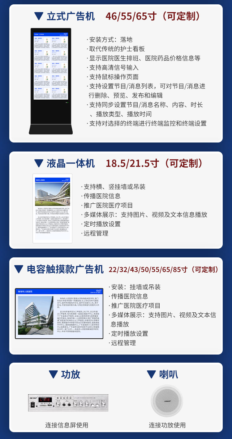 公司主营产品中,医院的多媒体信息发布系统、医院信息发布屏、医院信息发布系统等产品尤为突出。医院的多媒体信息发布系统能够将医院的各类信息,如科室介绍、专家出诊信息、健康科普知识等,以图文、视频等多种形式进行发布,方便患者及时了解相关信息,提高就医效率。该系统具有操作简便、信息更新及时、显示效果清晰等特点。医院信息发布屏则是该系统的重要展示终端,其具有高亮度、高对比度、高分辨率等优势,能够在不同的环境光条件下清晰显示信息。医院信息发布系统可根据医院的实际需求进行定制,满足不同医院的个性化需求。
