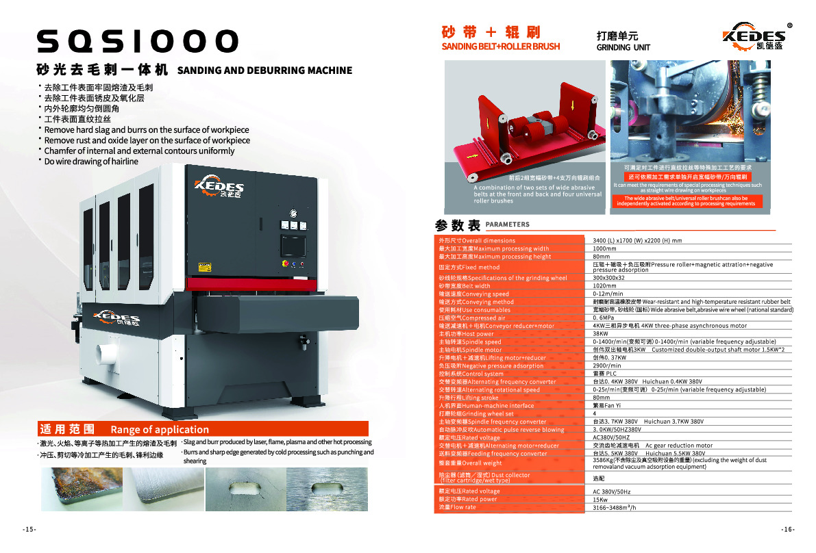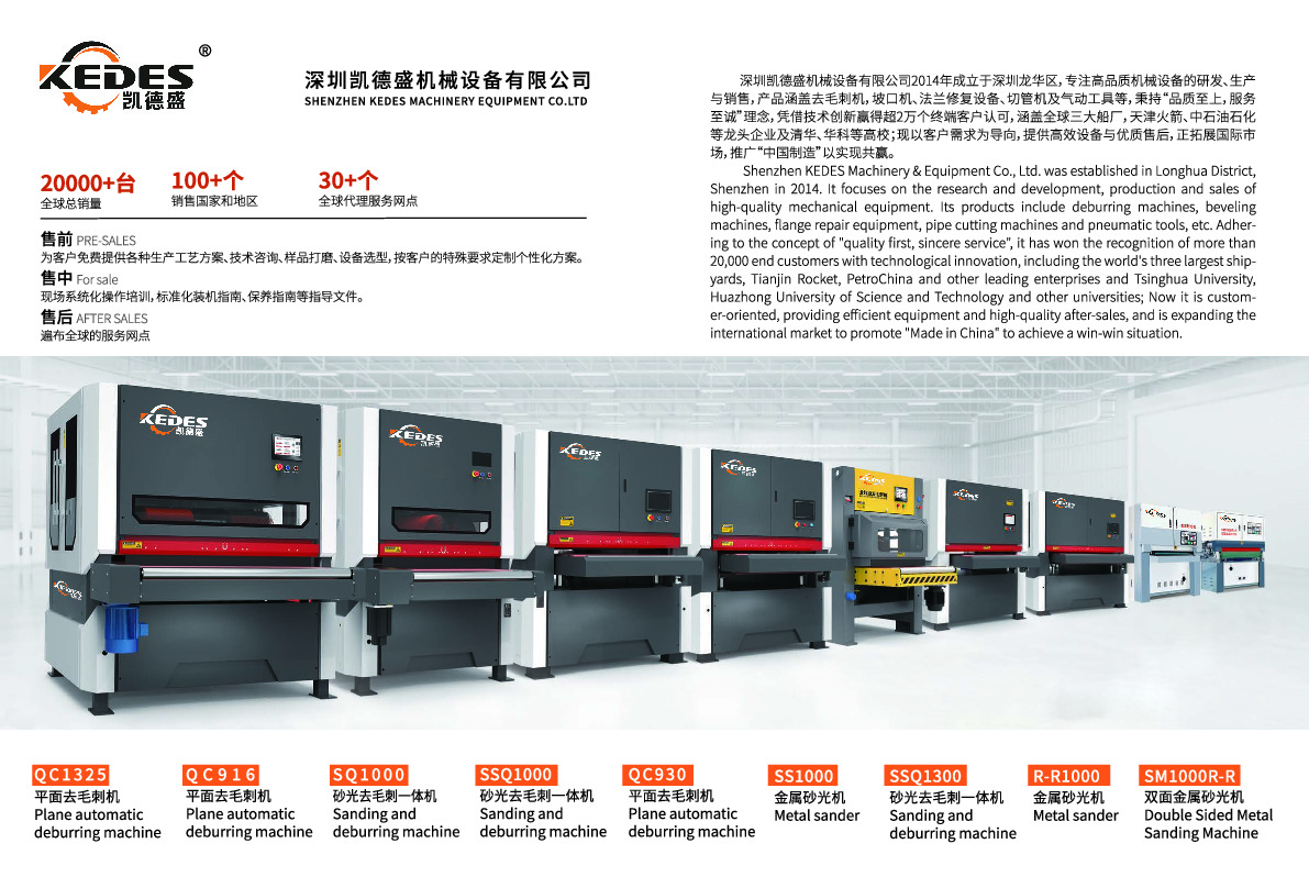 深圳凯德盛机械设备有限公司的主营产品丰富多样,性能突出。其主营产品包括砂光去毛刺集成机定制、金属表面砂光机批发以及平面毛刺清理机等。在金属表面处理设备系列中,平面去毛刺机(QC系列)采用万向辊刷,实现无死角磨削,倒圆角精度R0.5 - 1.5mm,输送速度0.5 - 10m/min,适配多种金属板材;砂光去毛刺一体机(SQ/SQS/SSQ系列)采用砂带 + 辊刷复合打磨,同步去除熔渣与氧化层,加工效率提升30%以上,还配备砂带跑偏自动纠正系统;金属砂光机(SS/R - R/SM系列)采用宽幅砂带或双面砂带系统,表面拉丝均匀,倒圆角精度R0.5 - 1.0mm,适配高表面质量需求领域。