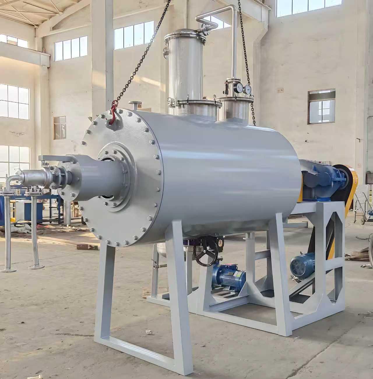ZB系列耙式真空干燥机由干燥主机、冷凝器、缓冲罐、真空泵等组成一个完整的真空干燥装置。在物料干燥过程中,耙齿不断正反转动,物料在干燥机内形成连续的循环翻动,从而大大提高了物料的干燥均匀性。而且,该设备在真空状态下进行干燥,能够降低物料的沸点,加快干燥速度,同时还可以避免物料在高温下发生变质等问题。与其他类型的干燥机相比,耙式真空干燥机具有干燥效率高、能耗低、对物料适应性强等优点。