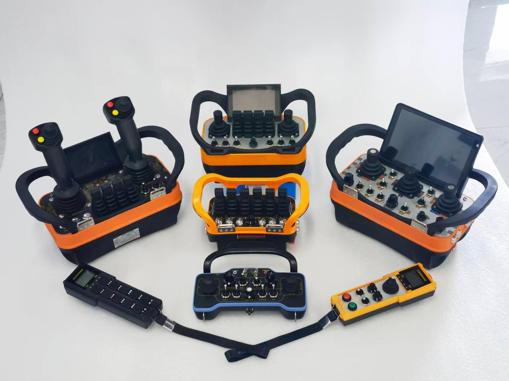 在功能上,奕九科技的遥控器极为丰富。可选装2.8寸、4.3寸显示屏,能实时反馈工作状态;还可加装7寸图传视频监控器。输出形式可选电流、电压、数据,也可根据需求任意组合。数据可选CAN2.0、Modbus、RS232/485、Profibus、Profinet等通讯协议。并且可以实现多对一、一对多功能,还可定制大于1KM超远距离信号传输。