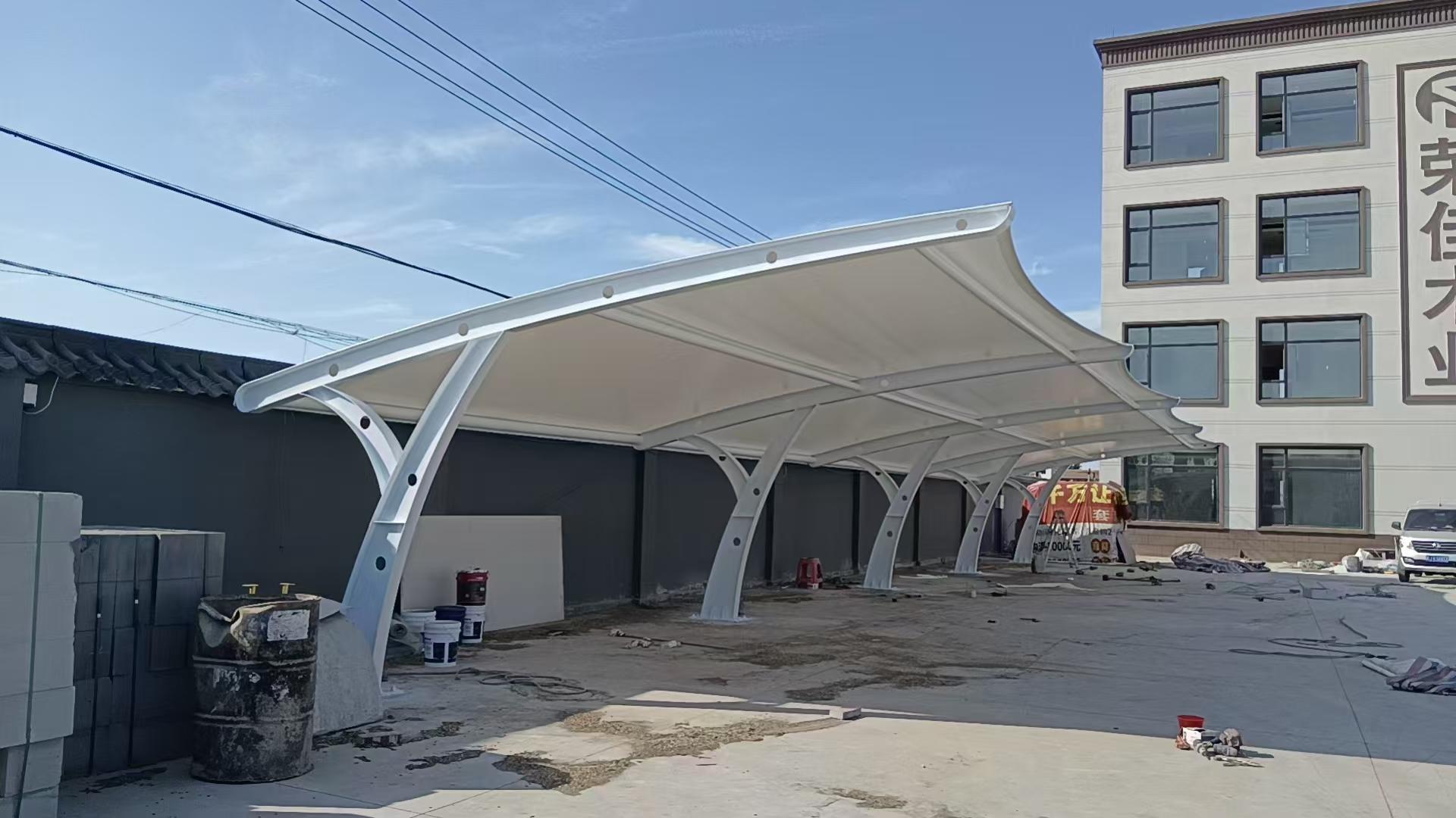 膜结构车棚是一种常见的停车设施,具有自重轻、受力性能好等特点,是大跨度空间结构的主要形式之一。它除了能满足车辆防风雨、防日晒等基本功能外,还具有较好的标识招揽效果。膜结构车棚的造型轻巧、别致,能够与周围环境相融合,提升停车场的整体形象。