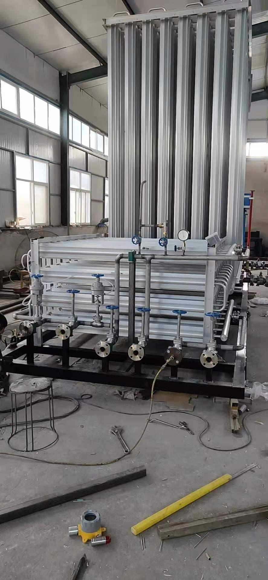 LNG气化撬也是公司的主营产品之一,主要应用范围广泛,包括城乡居民生活小区 、边远区人口集中地 、商业、餐饮等用户 、燃气锅炉用户、工业用户,如陶瓷厂、热轧厂、铝型材料厂等、燃气调峰站、燃气电厂。其产品特性丰富,无能耗、无污染;安装简单、维护方便;有多种规格换热管(m120、m160、m200),设备外形尺寸可供选择;优化设计,满足汽化量要求,降低成本,压降小,无偏流;设备整体采用铝型材'桥'式连接,美观大方,牢固使用,有效消除因热胀冷缩产生的应力;先进的高压管复合技术,使受压管和换热管100%接触,保证换热效果;设备所有部件按氧气服务标准进和行清洗和制造,使用更安全;气化能力为500Nm3/h;配置辅热器,保障气化出口温度;安全阀起跳压力为1.6Mpa;工作压力为0.02 - 1.0Mpa;专用低温铝材、特殊的表面抗氧化处理,延长使用寿命;宽裕的流量设计,满足国产、进口液化天然气的有效气化;完备的安全保护功能,确保设备使用安全可靠。