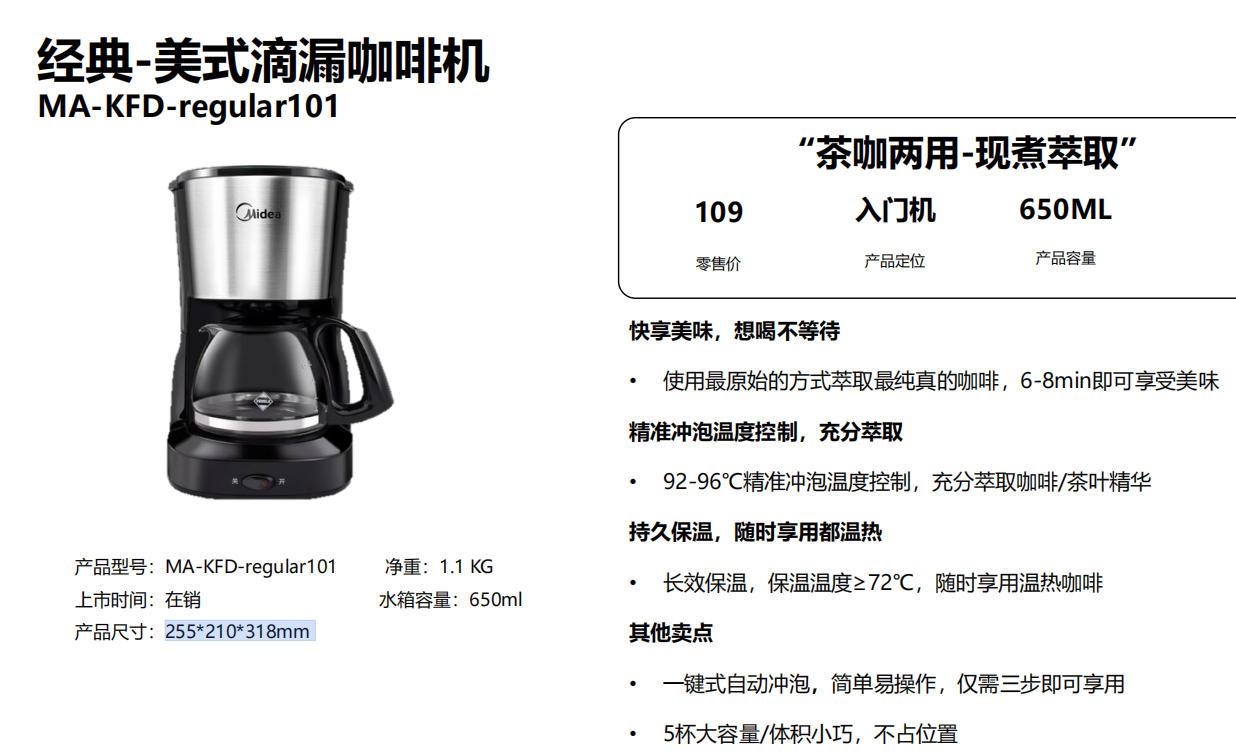美的小家电主营多种产品,其中咖啡机产品表现出色。美的自2019年率先布局咖啡机赛道,产品线覆盖滴滤式咖啡机、意式半自动咖啡机、研磨一体半自动咖啡机、全自动咖啡机四大品类。依托在咖啡机领域的专利布局和多年积累的研发与制造经验,美的研发团队耗时6年,突破国外专利壁垒,累计投入超1.2亿元,累计申请技术及发明专利147项,实现了全自动咖啡机从自主研发、供应链到生产制造的全产业链打通。