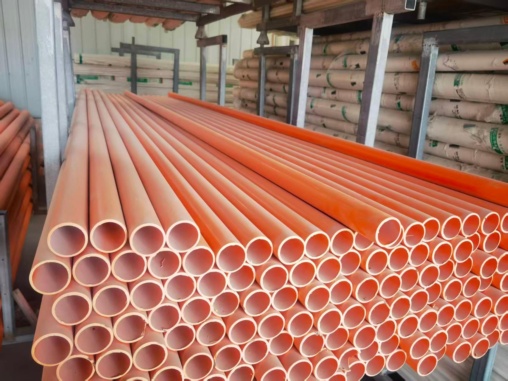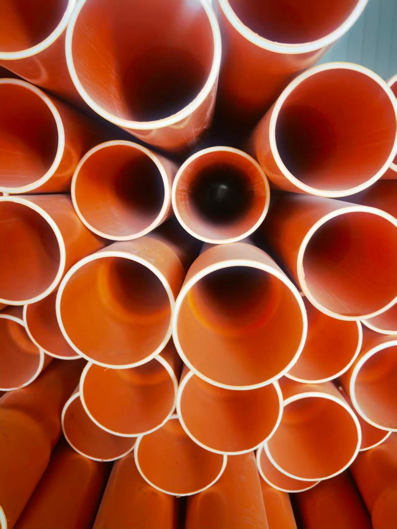 接下来详细介绍一下公司主营产品的用途和特点。首先是CPVC电力管,它主要用于城市电网建设和改造、城市市政工程改造、民航机场工程建设、工程园区、小区工程建设、交通、路桥工程建设、城市路灯电缆铺设、电信通讯、有线电视信号城域网线及光缆铺设护套管网,并起导向和保护作用。CPVC电力管通常用作电缆保护管,也叫CPVC电力保护管、CPVC电缆保护管。该产品具有高强度、柔韧性好、耐高温、耐腐蚀、阻燃、绝缘性能良好、无污染、不易老化、质轻、施工方便等特点。产品性能优于传统的石棉电缆排管及普通PVC管材,是传统电力电缆护套管的理想替代品。CPVC电力管以CPVC树脂为主要材料,CPVC树脂由聚氯乙烯(PVC)再次氯化改性而成的高分子材料,是一种应用前景广阔的新型工程塑料。该产品为白色或淡黄色无味、无臭、无毒的疏松颗粒或粉末,是目前公认的绿色环保产品,其优异的物化性能正越来越受到行业的重视。CPVC电力管是硬直实壁管,内、外壁光滑平整,颜色呈桔红色,色泽明亮、醒目。