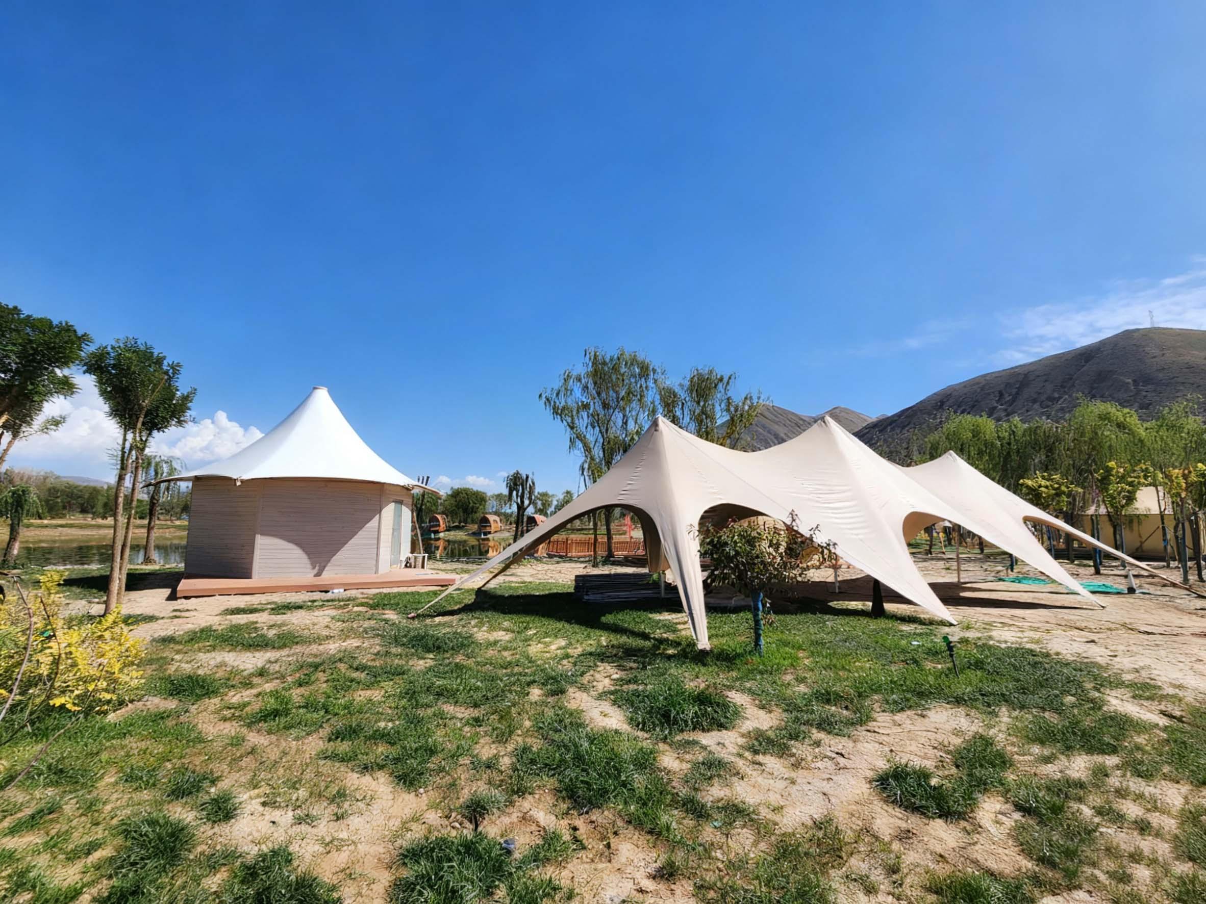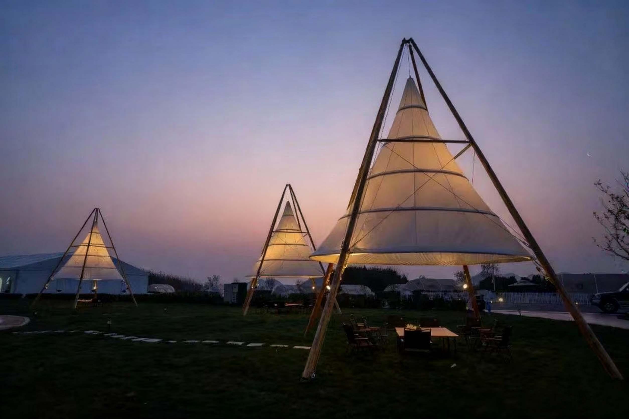 **钟形帐篷**也是公司的主打产品之一。钟形帐篷造型独特,具有很强的视觉冲击力。它采用了先进的结构设计和材料,具有良好的稳定性和抗风性能。钟形帐篷内部空间较大,可以根据客户的需求进行个性化的布置,如设置休息区、娱乐区等。此外,钟形帐篷还可以搭配各种户外设施,如遮阳伞、烧烤架等,为游客提供更加丰富的户外体验。