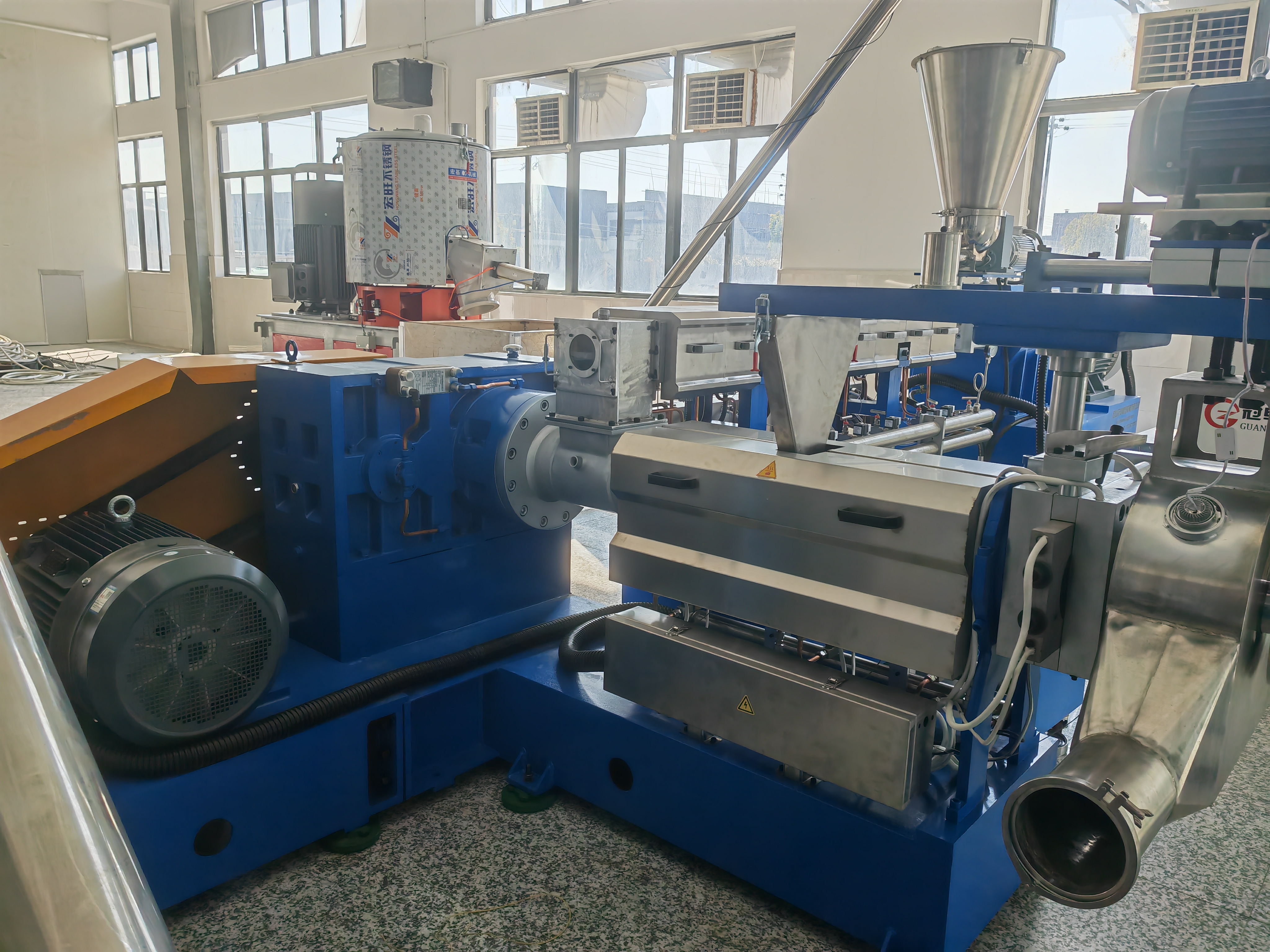 PE炭黑高填充母粒造粒机:该设备主要用于生产PE炭黑高填充母粒。PE炭黑高填充母粒在塑料制品中起着重要的作用,它可以提高塑料制品的强度、耐候性和抗老化性能等。昆山冠卓橡塑机械有限公司生产的PE炭黑高填充母粒造粒机具有高效稳定的特点。其独特的螺杆设计能够使物料在机筒内充分混合和塑化,保证了母粒的质量均匀。而且该造粒机的产量较高,可以满足大规模生产的需求。在生产过程中,它的能耗相对较低,有助于降低生产成本。