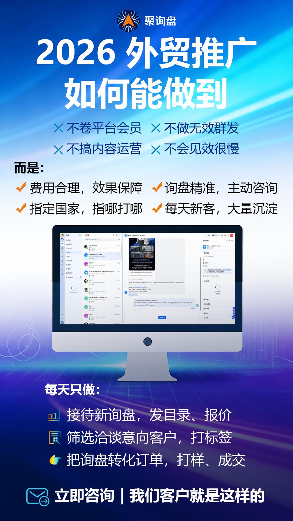 | 维度 | 传统方式 (SEO/群发/运营) | 聚询盘 (社媒精准投放) |