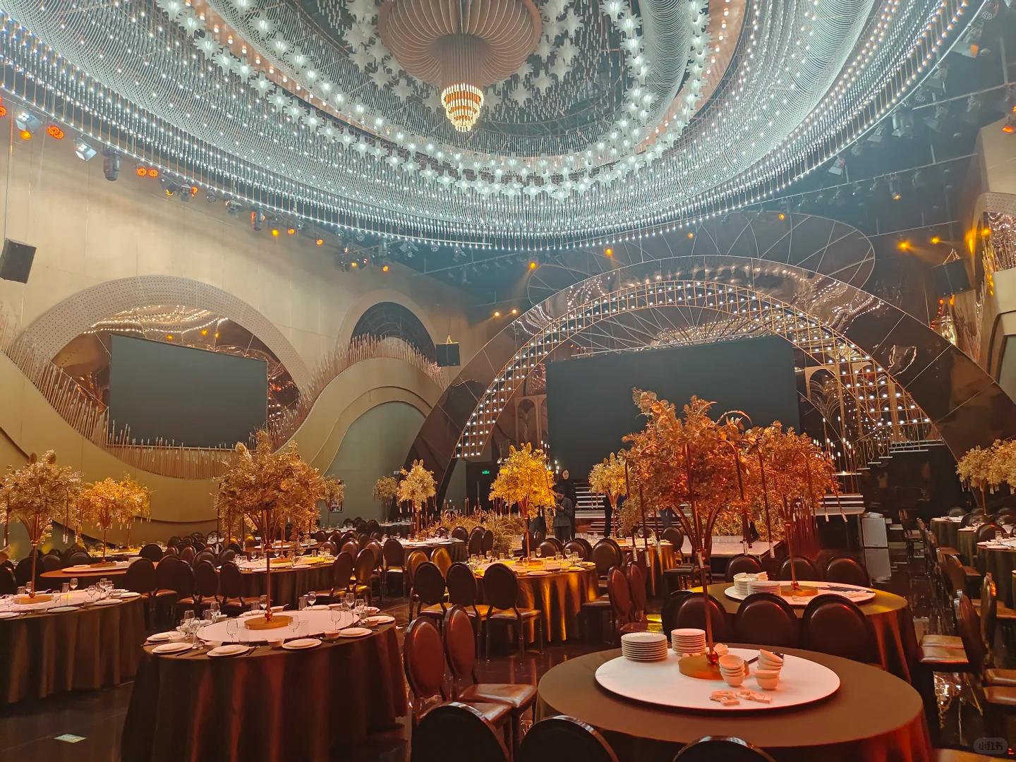 该礼宴中心的硬件设施与技术实力也相当突出。全系宴会厅配备高清LED电子大屏、定制化灯光秀(面光、追光、T台聚焦光)及沉浸式声场系统,能为宾客带来视觉盛宴。还有可弹奏红色钢琴、粉色劳斯莱斯打卡车、网红楼梯、海底世界元素大屏及教堂式拍照区等特色装置,打造出网红级社交传播属性。包厢配置也十分贴心,提供带独立卫生间、茶台及三面落地窗的豪华包厢,部分包厢(如999包厢)配备专业KTV系统,满足多元化娱乐需求。