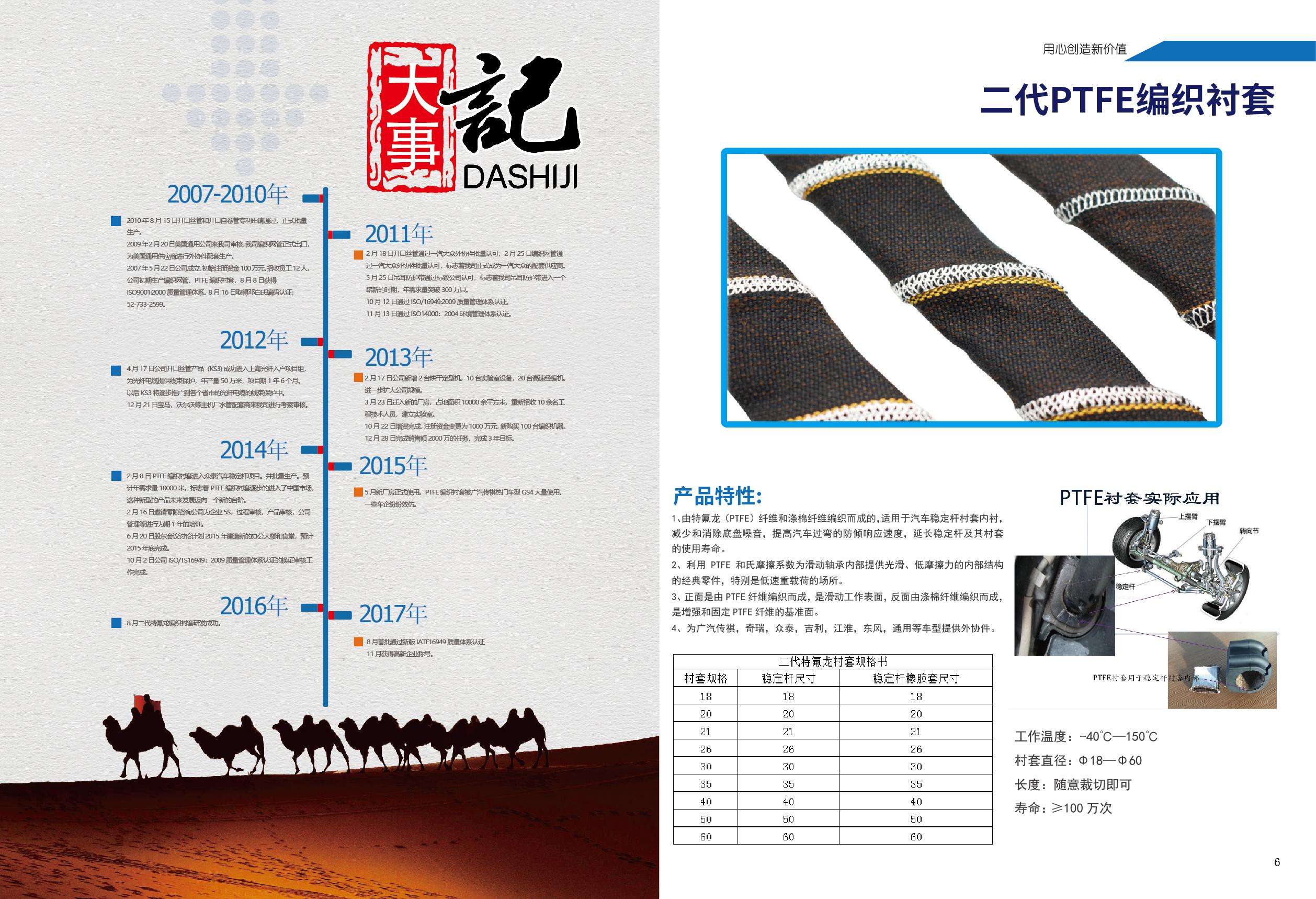 公司还是一代PTFE编织衬套厂商和三代PTFE编织衬套厂。PTFE编织衬套具有独特的性能,它由特氟龙(PTFE)纤维和涤棉纤维编织而成,适用于汽车稳定杆衬套内衬。这种衬套能够减少和消除底盘噪音,提高汽车过弯的防倾响应速度,延长稳定杆及其衬套的使用寿命。其正面是由PTFE纤维编织而成,是滑动工作表面,反面由涤棉纤维编织而成,是增强和固定PTFE纤维的基准面。工作温度范围在 -40℃—150℃,衬套直径为Φ18—Φ60,长度可以随意裁切,寿命≥100万次。