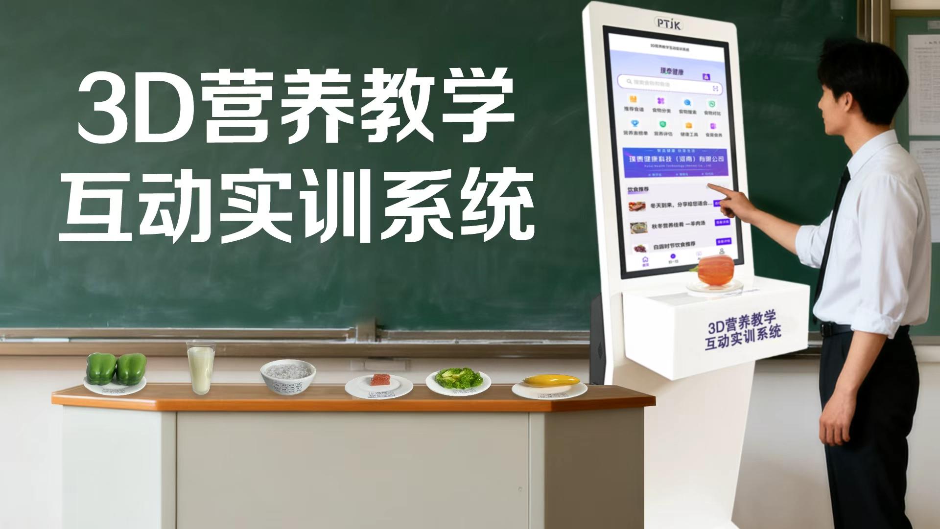 璞泰健康科技(河南)有限公司的旗舰产品是一个深度交互的智慧实训环境。系统由后台数据中心、前台应用软件、一台32寸营养分析终端大屏以及80个(可扩展)智能电子食物模型共同组成。