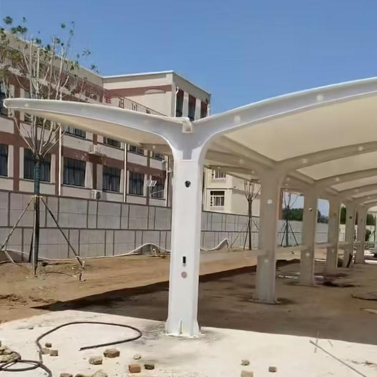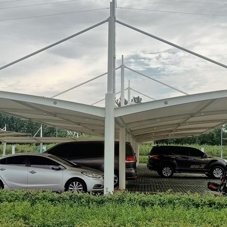 张拉膜车棚也是公司的重点产品。它具有独特的张拉结构,能够承受较大的荷载,保证车棚的稳定性和安全性。这种车棚的艺术性强,能够为场所增添独特的景观效果。同时,其耐久自洁的性能使得车棚在长期使用过程中能够保持干净整洁,减少维护成本。
