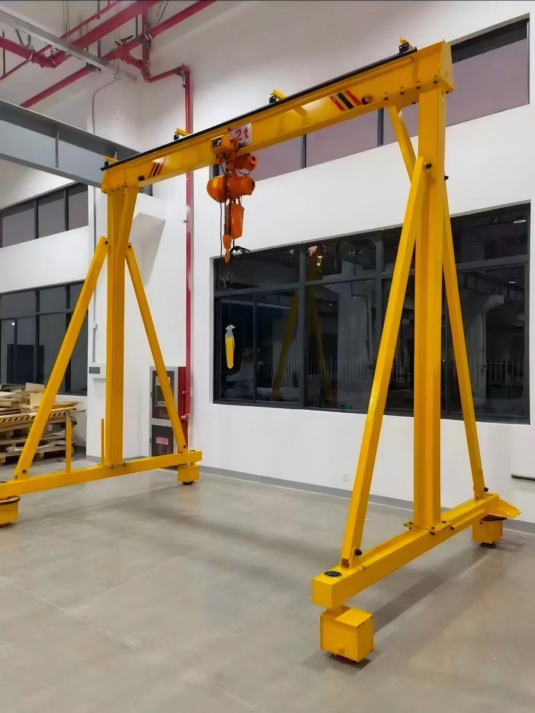 简易龙门吊:成本相对较低,结构简单,易于操作。它适用于一些对起重要求不高的场合,如小型作坊的货物起吊、维修车间的设备安装等。