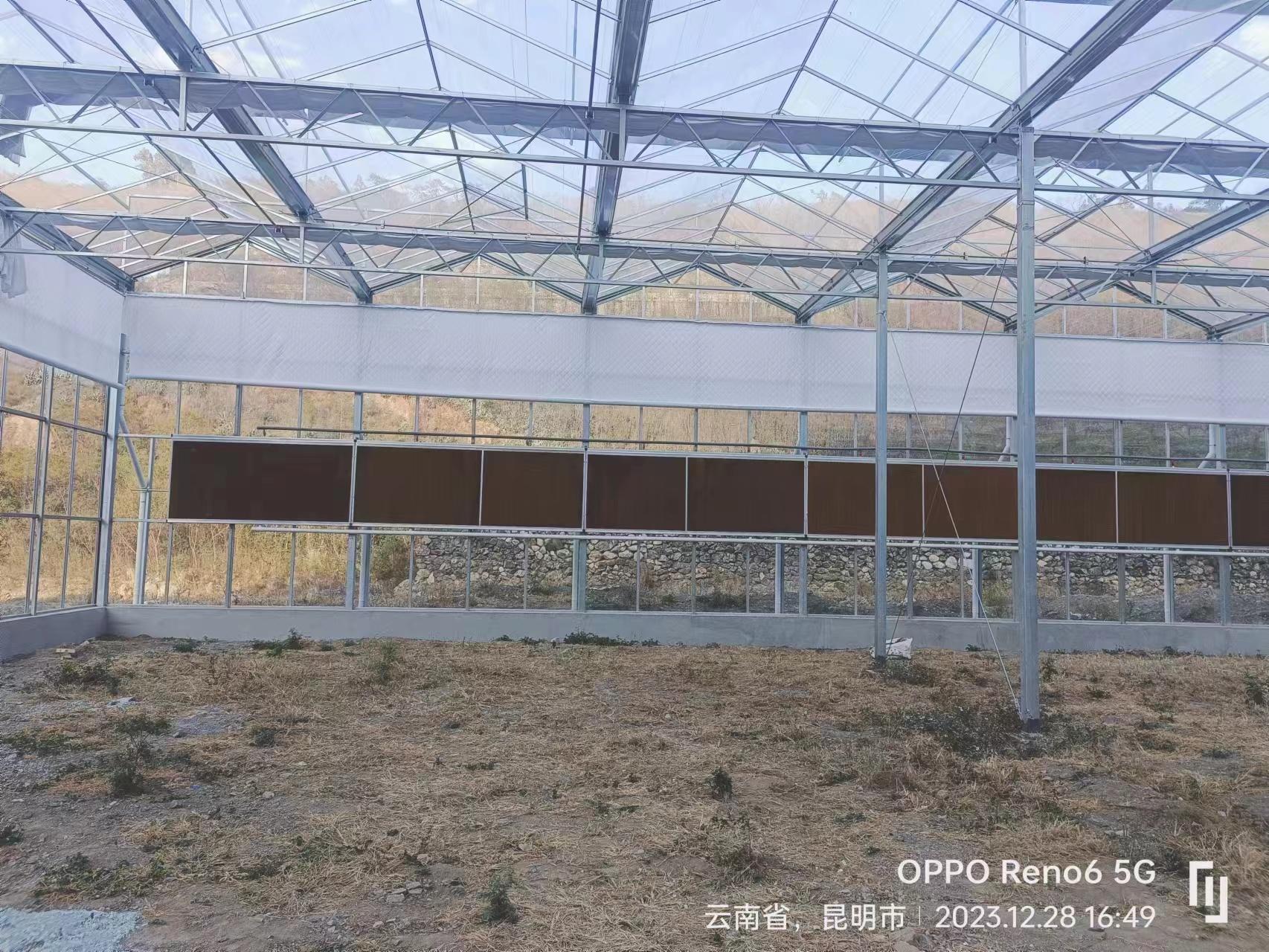 玻璃连栋大棚:采用玻璃作为覆盖材料,具有高透光性的特点。充足的光照有利于作物进行光合作用,促进作物的生长和发育。同时,玻璃连栋大棚的结构坚固,抗风抗雪能力强,能够保证在恶劣天气下的稳定性。
