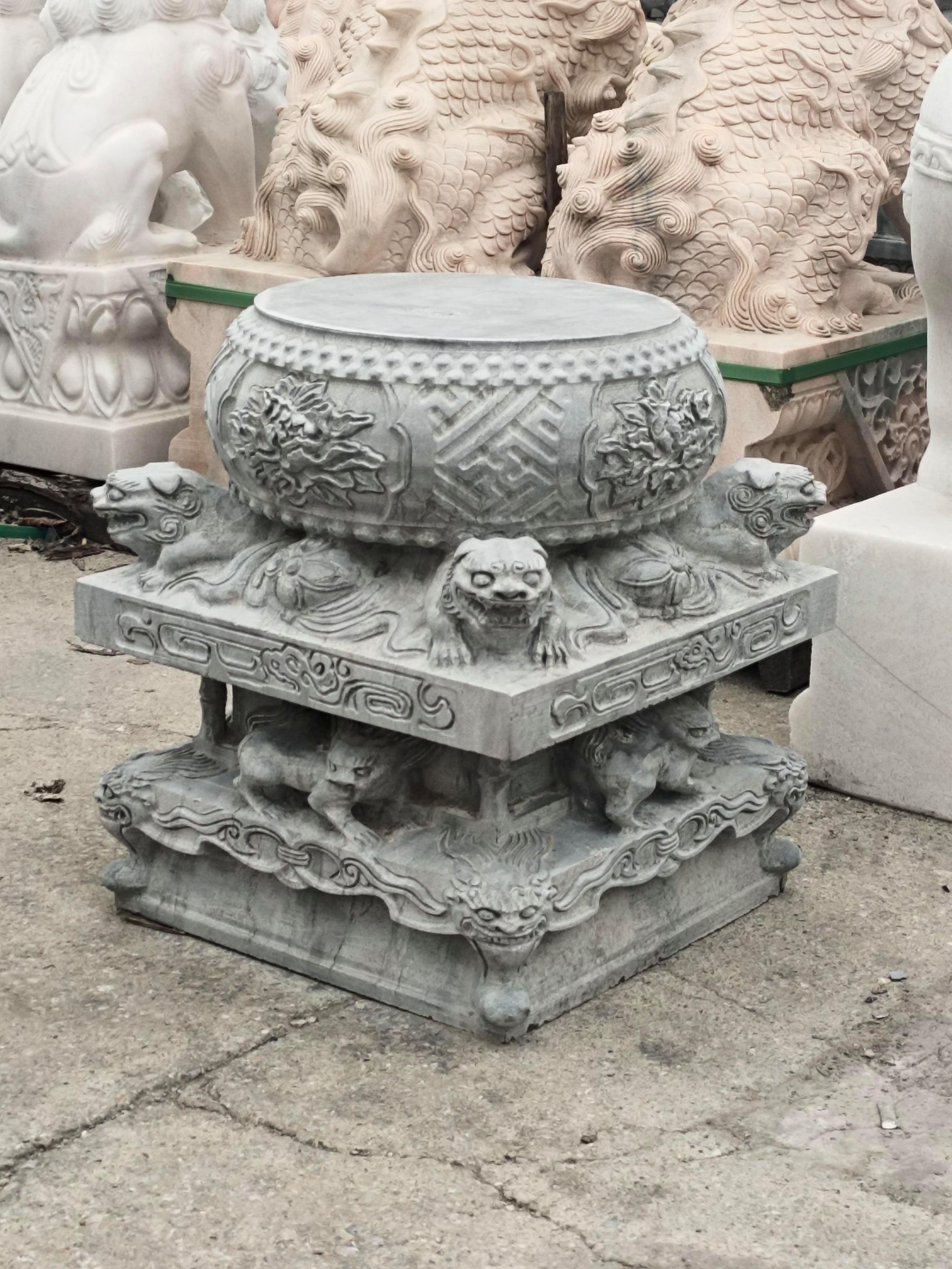 青石圆鼓形柱顶石,造型独特,圆润饱满,给人一种稳重、和谐的感觉。常用于寺庙、道观等宗教建筑,以及一些具有传统风格的庭院、园林中。它的外观设计美观大方,与周围环境相得益彰。