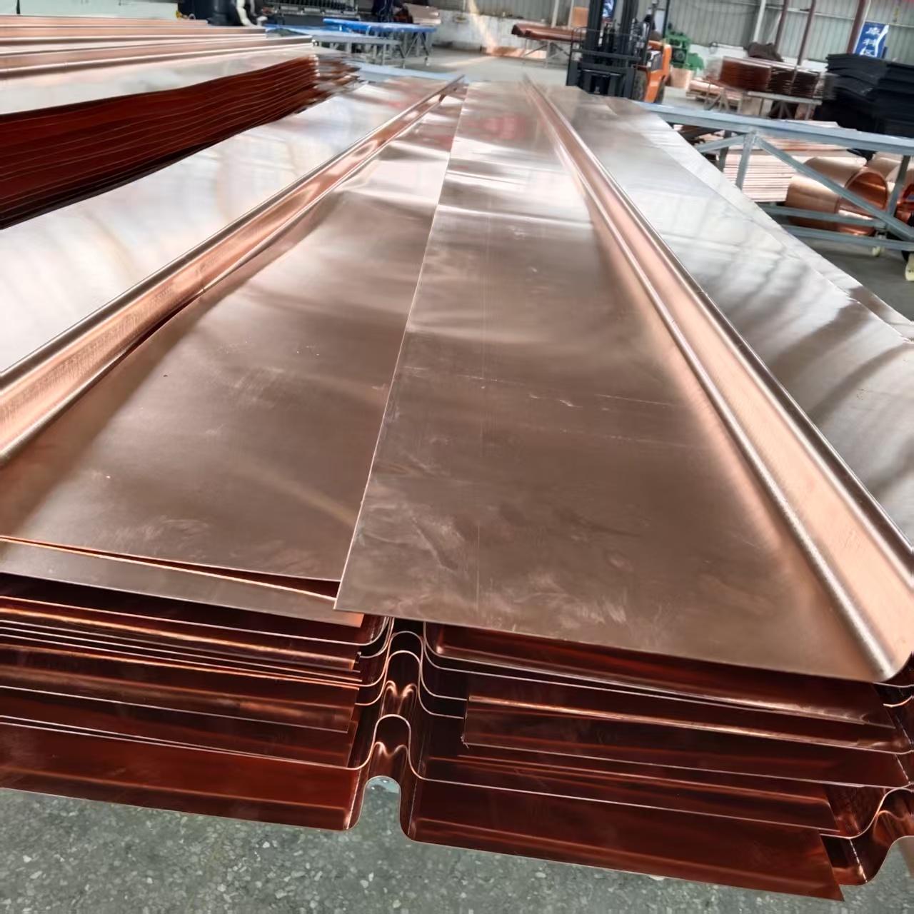 止水铜片常用于水利、建筑等工程的防水部位。其材质特性使其在防止水渗透方面发挥着关键作用。止水铜片常用牌号为T2、T3紫铜,铜含量≥99.90%(T2)、≥99.70%(T3),材质延展性好,可适应结构变形,不易开裂。规格尺寸方面,厚度常规规格为0.8mm–2.0mm,可按需定制,厚度均匀性偏差≤±0.05mm;宽度常用200mm–600mm,可根据工程缝宽调整;成型结构包含平板段、止水肋(中肋 / 边肋),肋高一般为20mm–50mm,肋宽15mm–30mm,成型规整无翘曲。力学性能上,抗拉强度≥200MPa;伸长率≥30%,保证在结构伸缩、沉降过程中不被拉断;硬度布氏硬度(HB)≤85,具备良好的冷弯加工性能。在耐腐蚀性能方面,止水铜片在淡水、海水、土壤等介质中耐腐蚀性能良好,经人工加速腐蚀试验后,表面无明显点蚀、开裂现象,可满足长期工程使用需求。工艺性能上,冷弯性能表现为常温下弯曲180°,弯曲半径为厚度的6倍,弯曲处无裂纹;焊接性能方面,可采用钎焊、氩弧焊等工艺,焊接接头强度≥母材强度的80%,焊缝密实无渗漏。止水密封性能经水压密封试验,在0.2MPa–0.5MPa水压下恒压30min,接缝处无渗漏现象。