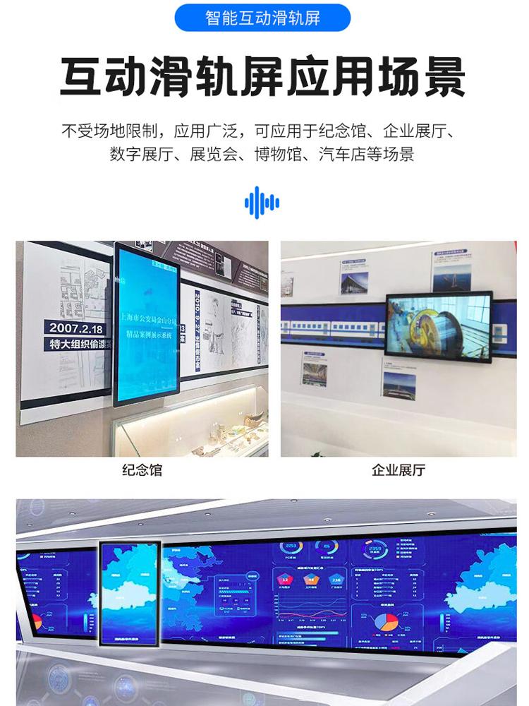 在众多主营产品中,互动滑轨屏是公司的特色产品之一。互动滑轨屏可以广泛应用于展厅、展馆等场景,通过与观众的互动,增强展示效果,提升观众的参与度。其特点在于能够根据观众的操作实时展示不同的内容,为观众带来更加丰富和生动的体验。