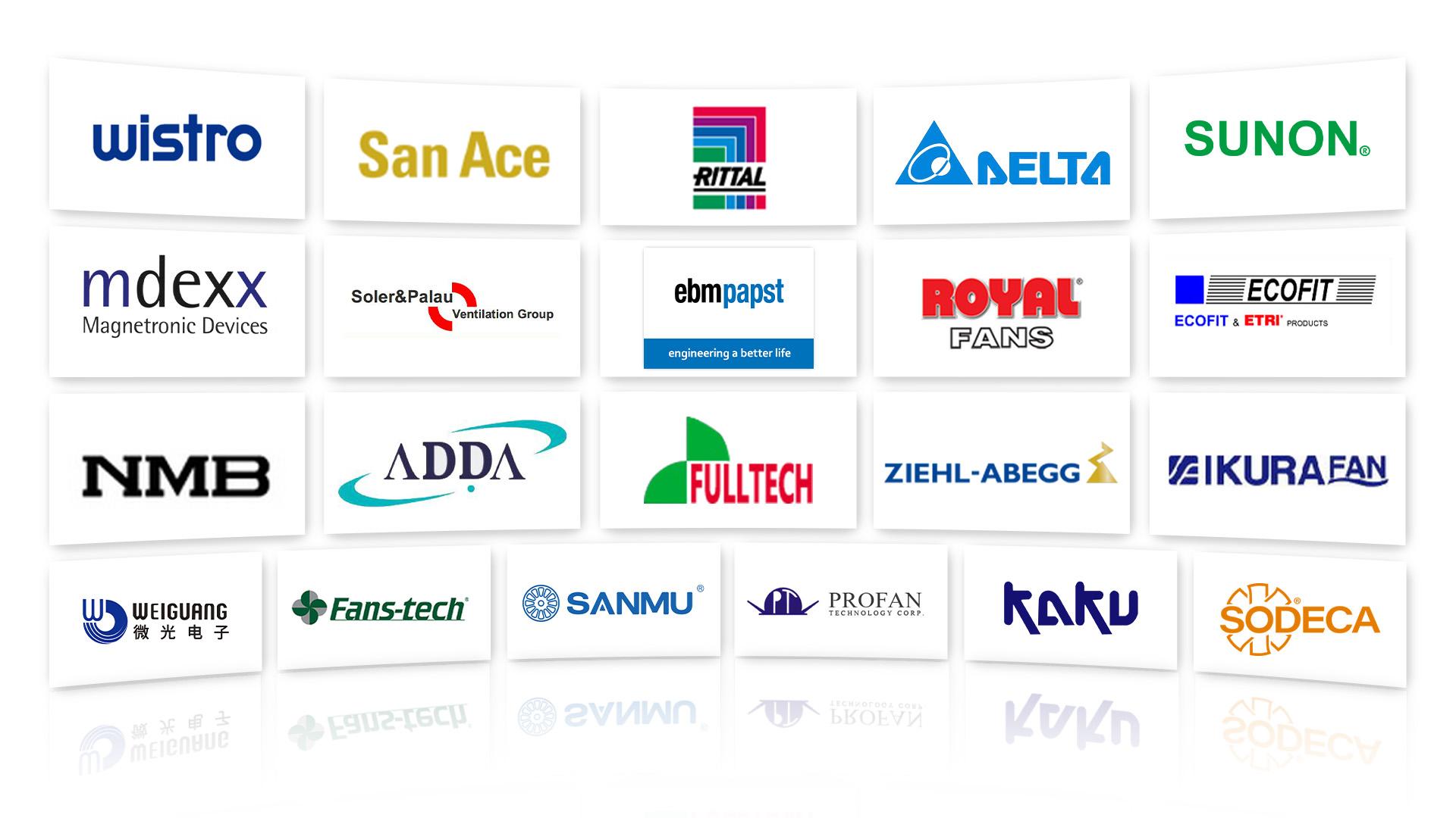 公司与国内外众多风机品牌和市场保持紧密且长久的合作,在通风散热领域耕耘多年。目前已获得ebmpapst、wistro、DELTA(台达)、SANYO(山洋)、S&P (EMC ) 、mdexx 、 KAKU( 卡固)等品牌授权代理证书,并优势供应Ziehl - Abegg、cesotec、ecofit、Fulltech(福佑)、SUNON(建准)、RISUN(鸿进)、SINWAN(信湾)、DARING(达盈)、ADDA、NMB - MAT、ROYAL、IKURA(育良)、为弘、三巨等各类名优风机产品。
