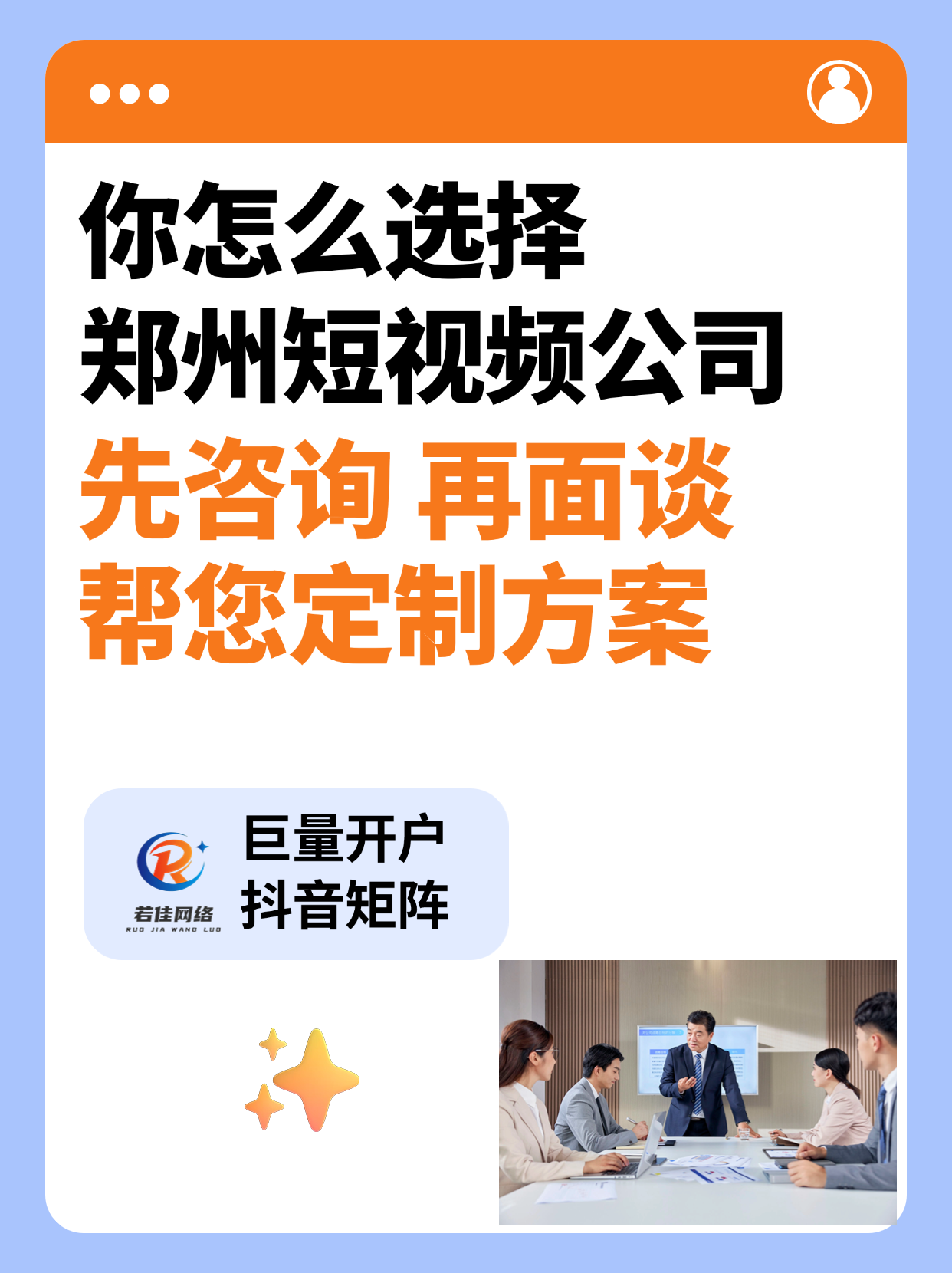 郑州若佳网络科技有限公司服务的行业广泛,尤其在企业工厂实体制造业行业有着丰富的经验。公司秉承“为客户解决获客难题,助力企业轻松获客”的使命,致力于成为河南本土受信赖的网络营销服务商。在短视频运营方面,公司已经积累了4年的经验,形成了一套成熟的运营方式。其重点优势在于结合短视频和广告营销投放思路,通过广告投放的方式以及定制化的短视频文案,帮助客户拿到不错的线索。公司服务的卫生间隔断行业、河南透水砖行业、管道行业、教育职业培训行业、酒店运营行业、推拉蓬行业等都有不错的案例。