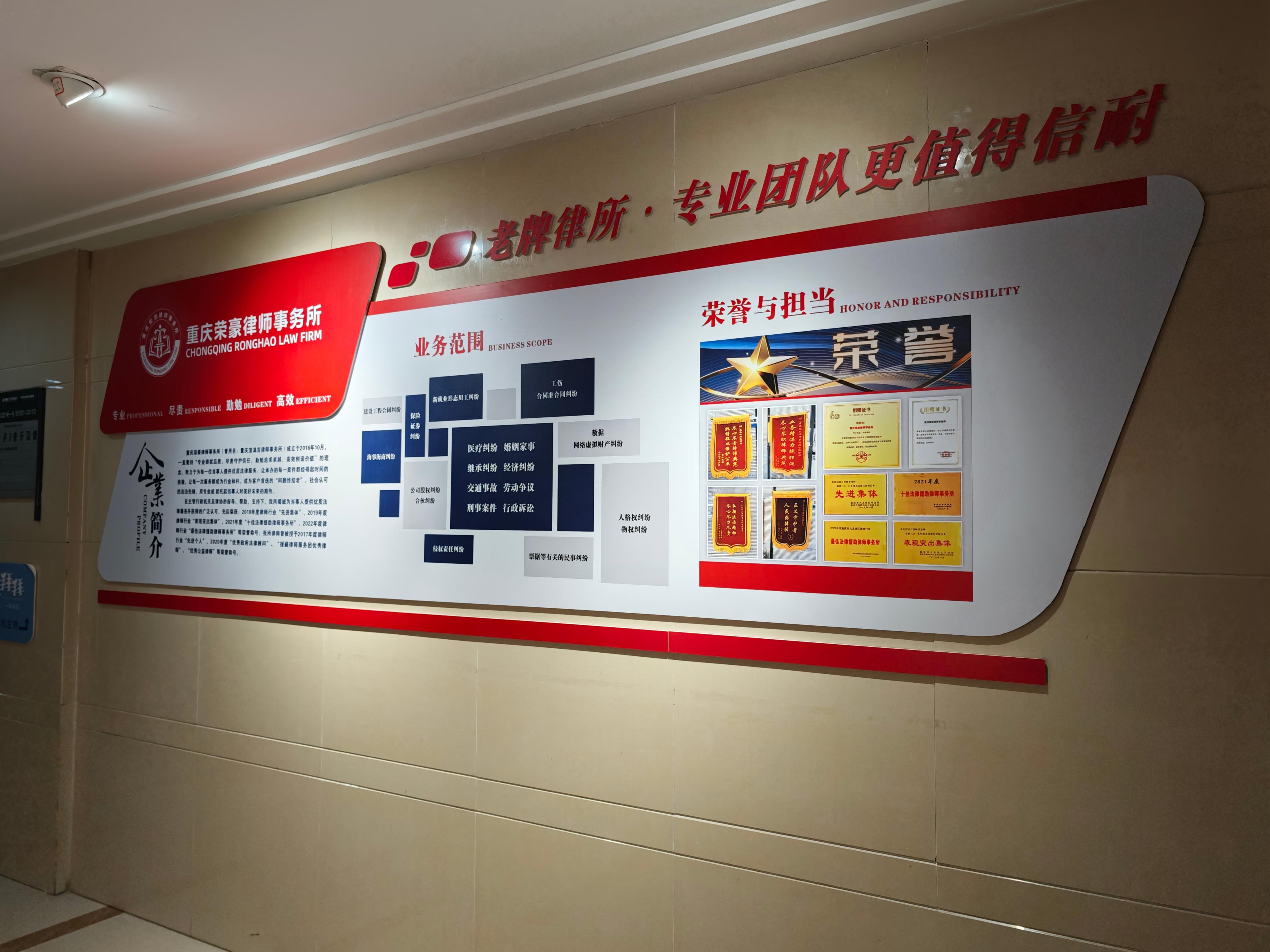 重庆荣豪律师事务所在主管行政机关及律协的指导、帮助、支持下,竭诚为当事人提供优质法律服务并获得了广泛认可。该律所先后荣获了2018年度九龙坡区律师行业“先进集体”、2019年度九龙坡区律师行业“表现突出集体”、2021年度九龙坡区律师行业“优秀法律援助律师事务所”、2022年度九龙坡区律师行业“优秀法律援助律师事务所”等荣誉称号。律所的律师也曾被授予2017年度律师行业“先进个人”、“援藏律师服务团优秀律师”等荣誉称号,还曾被聘为区统计局、九龙街道办事处、区普法讲师团、区信访维稳律师智囊团、区社会稳定风险评估专家库、学生突发事件处置工作中心等单位的法律顾问或专家成员,在务实进取中,得到了社会各界的一致好评。