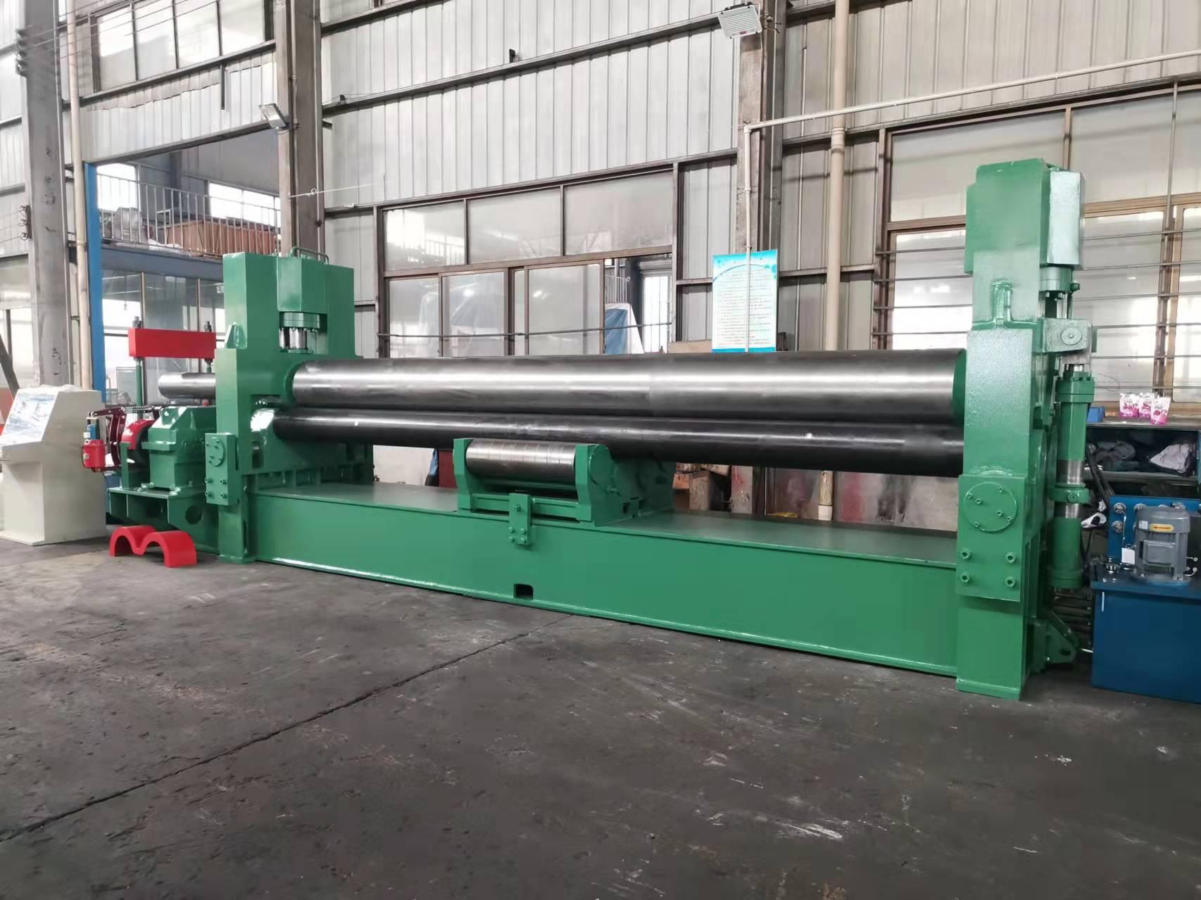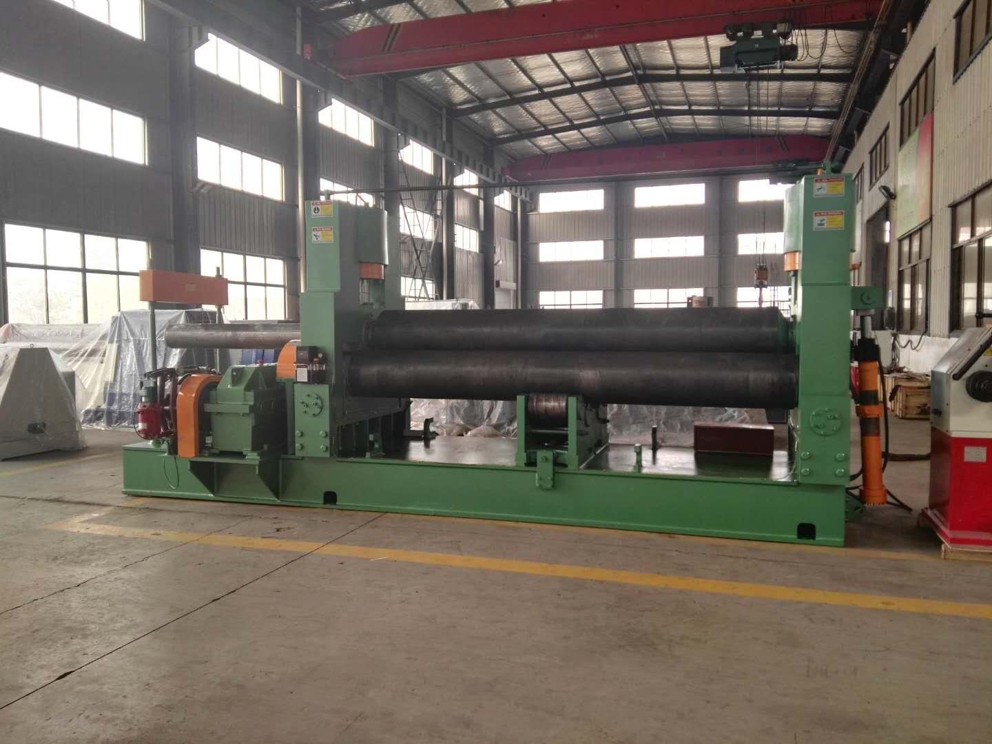 对称式卷板机上辊在两下辊中央对称位置通过液压缸内的液压油作用于活塞作垂直升降运动,通过主减速机的末级齿轮带动两下辊齿轮啮合作旋转运动,为卷制板材提供扭矩。卷板机规格平整的塑性金属板通过卷板机的三根工作辊(二根下辊、一根上辊)之间,借助上辊的下压及下辊的旋转运动,使金属板经过多道次连续弯曲(内层压缩变形,中层不变,外层拉伸变形),产生**性的塑性变形,卷制成所需要的圆筒、锥筒或它们的一部分。该液压式三辊卷板机缺点是板材端部需借助其它设备进行预弯。该卷板机适用于卷板厚度在50mm以上的大型卷板机,两下辊下部增加了一排固定托辊,缩短两下辊跨距,从而提高卷制工件精度及机器整体性能。