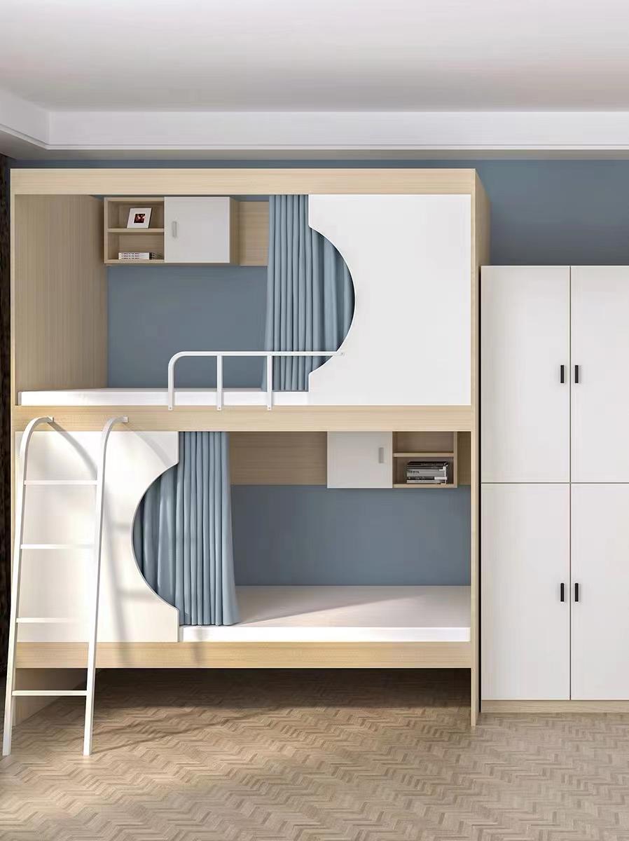 从实用性角度来说,太空舱上下床还配备了一些实用的功能。例如,有的款式会在床边设置小书桌和书架,方便学生在床上使用电脑、阅读书籍等。同时,还会有一定的储物空间,可以用来放置衣物、杂物等,让宿舍更加整洁有序。