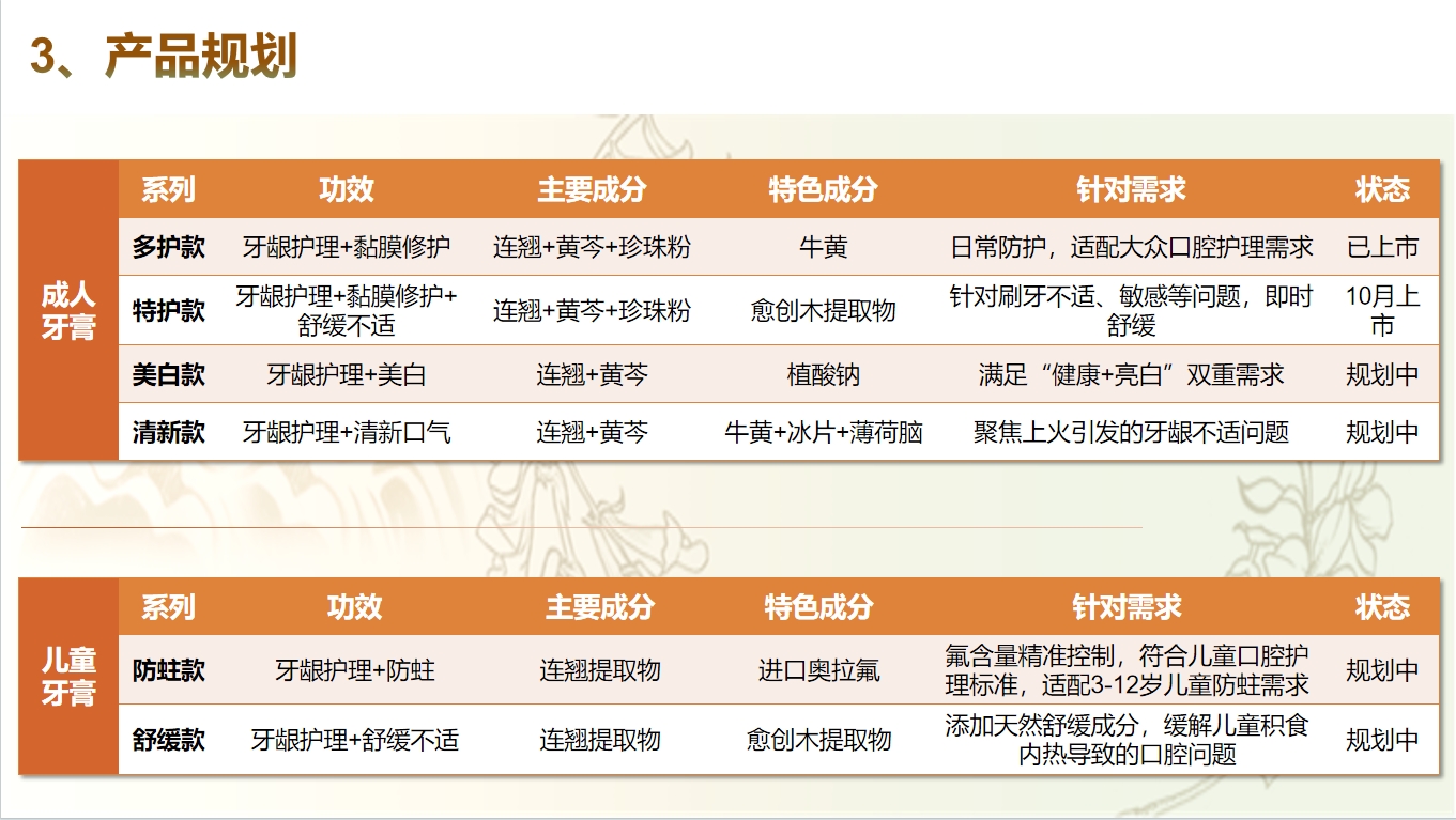连芩珍珠牙膏的成人牙膏系列包括多效款、特护款、美白款和清新款。多效款预计8月上市,主打日常防护,适配大众口腔护理需求,主要成分有连翘、黄芩和珍珠粉,次要成分包含牛黄,具有牙龈护理和黏膜修护的功效。特护款预计9月上市,针对刷牙不适、敏感等问题,能即时舒缓,在主要成分连翘、黄芩、珍珠粉的基础上,新增了愈创木提取物(天然舒缓成分),不仅能进行牙龈护理和黏膜修护,还能舒缓不适。美白款目前处于规划中,满足“健康 + 亮白”双重需求,主要成分是连翘和黄芩,特色配方成分有植酸钠。清新款同样在规划中,聚焦上火引发的牙龈不适问题,主要成分是连翘和黄芩,特色配方成分包含牛黄、冰片和薄荷脑,能在进行牙龈护理的同时清新口气。