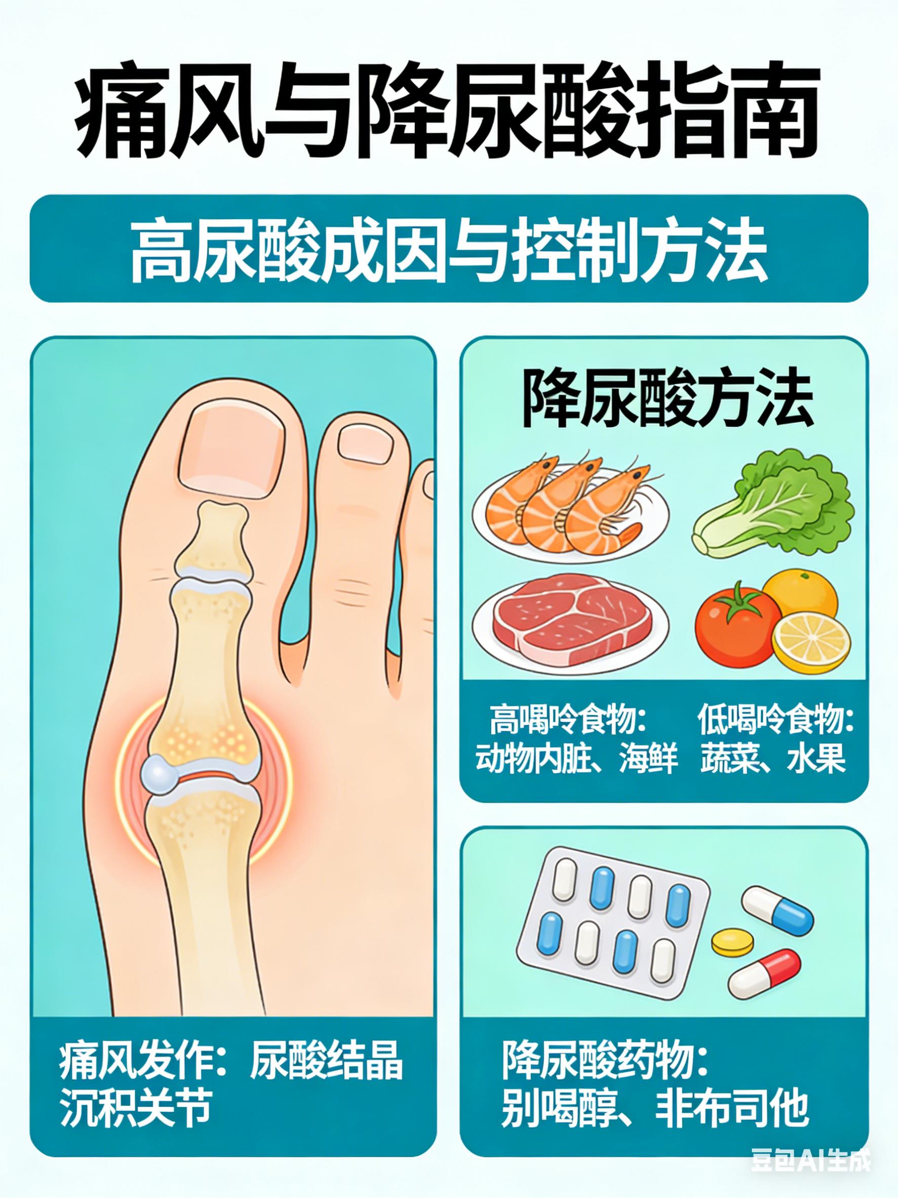 痛风,被称为“不死的癌症”,给患者带来了极大的痛苦。痛风主要由尿酸排泄减少和摄入嘌呤食物太多两个因素引起。发作时,尿酸结晶体常以针尖状刺激足、手、膝、肘等关节神经,使患者痛疼难忍。长期的高尿酸血症会导致尿酸盐沉积于各关节部位,造成结晶和痛风石,还会引发痛风性关节炎、代谢疾病、加重病变以及尿酸性肾病等多种危害。