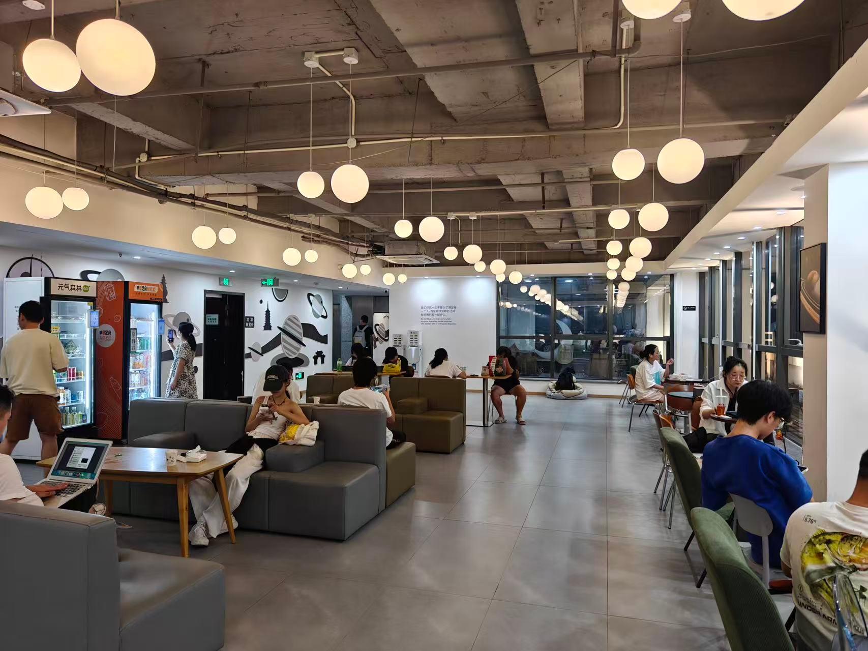 公共区域面积达500平米,ins风新潮设计搭配治愈系布置,拍照出片率极高,同时配备舒适沙发、休闲座椅、临时办公区,满足独处放空、好友闲谈、求职办公等多种需求,专门设置独立外卖区,干净整洁、分区明确,配备桌椅与取餐架,避免外卖堆积,方便住客有序取餐、安心用餐,搭配窗外运河景观,解锁惬意用餐体验。
