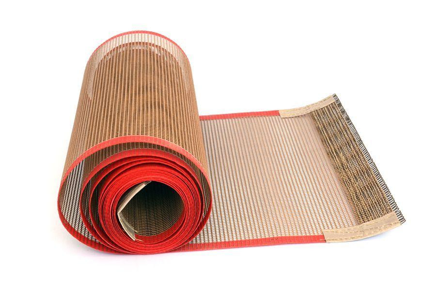 PTFE(特氟龙)网格输送带是以悬浮聚四氟乙烯 (俗称塑料王) 乳液为原料,浸渍高性能玻璃纤维网而成,是一种高性能多用途的复合材料新产品。适用温度范围为 -140°C~280°C 之间,同样具有耐气候性、抗老化,耐化学腐蚀,能耐强酸、强碱、王水及各种有机溶剂的腐蚀。非粘着性使其不易粘附任何物质,易于清洗附着其表面的各种油渍、污点或其它附着物;浆糊、树脂、涂料等几乎所有粘着物质都可以简单地清除。尺寸稳定 (延伸系数小于千分之五)、强度高,具有良好的机械特性。抗弯曲疲劳,可用于较小轮径。耐药剂性、无毒性,几乎可耐所有药剂物品。而且输送带具备透气率,可减少热源耗费、提高干燥效率。