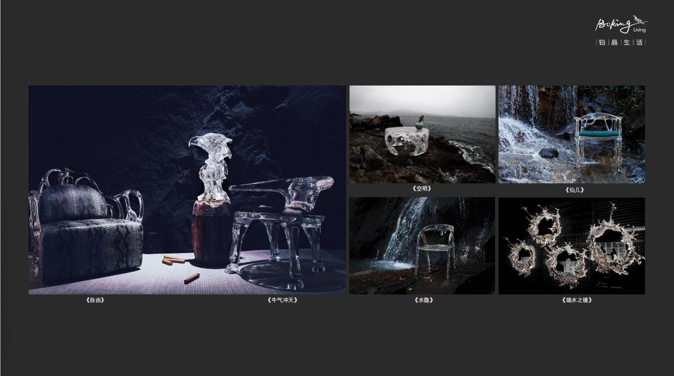 在产品创作方面,铂晶艺术以水晶重构东方美学,创作了太湖石系列,上善若水系列两大主要艺术作品系列。同时,通过对艺术作品的演绎,开发出一系列具有使用功能的艺术品,如网红作品《瑞水之镜》,《水隐》(水滴椅),《玄液》躺椅,《秘漩》茶桌等,深受设计师及对生活美学有较高追求人士的喜爱。铂晶艺术的艺术家居的成功,源于创始人吴代杰对艺术与设计的边界的探索,也形成了透明艺术家居这一新领域。