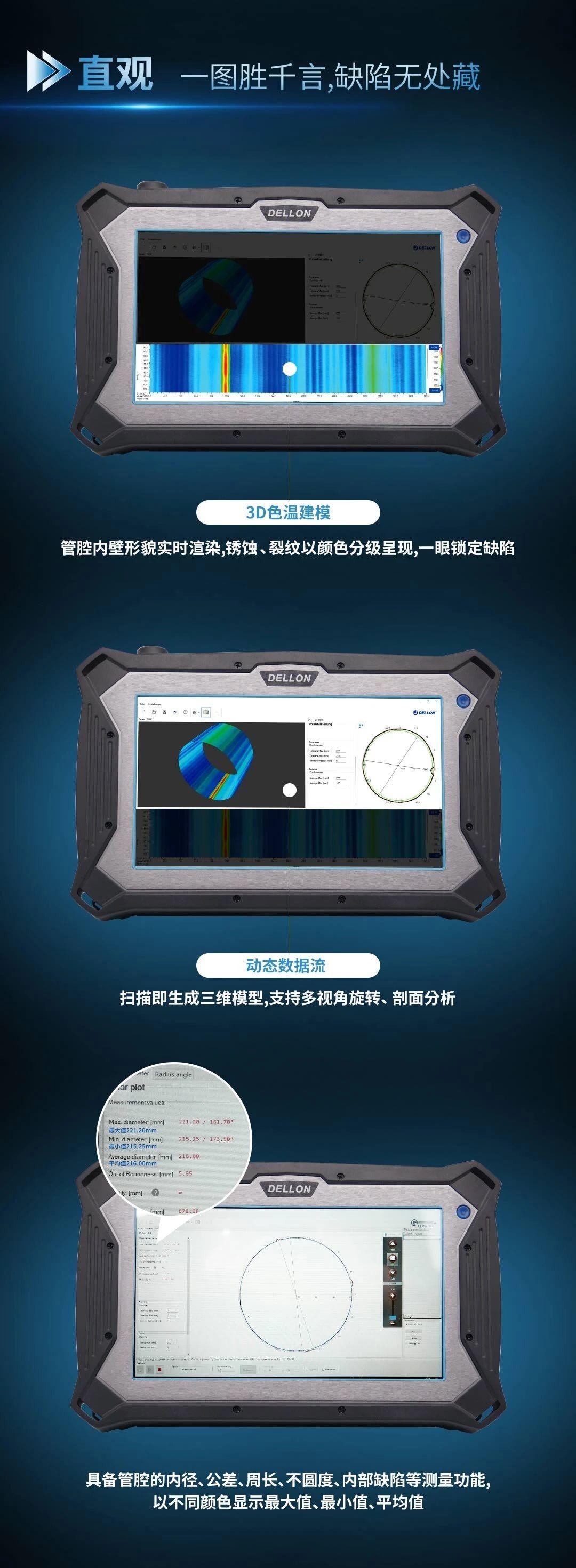 DVS700D管腔内壁激光三维测量系统是河南德朗智能科技有限公司的一款重要产品。它采用先进的激光技术,能够快速、准确地获取管腔内壁的三维信息。该系统具有操作简便、测量速度快的特点,适用于各种管径和材质的管道检测。通过该系统,企业可以及时了解管腔内壁的磨损、腐蚀等情况,为管道的维护和修复提供依据。