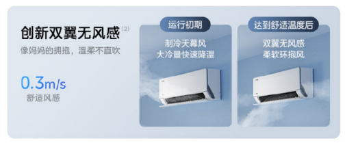 美的无风感・云朵专为母婴等睡眠敏感人群定制的空调,精准解决用户直吹不适、呼吸健康、电费焦虑三大痛点。通过双翼无风感科技,实现有凉感无风感,避免直吹带来的不适,适配老人、宝宝等敏感人群,打造全屋舒适无风带。母婴级净护,搭配一键母婴模式,精准控温控湿控风,为家人提供洁净健康的呼吸环境。其创新双翼无风感,像妈妈的拥抱,温柔不直吹;0.3m/s舒适风感;业内推出无风感科技,成为全网热销的“宝藏”空调;双翼无风感:有凉感,无风感;母婴级净护,专为敏感人群设计,除菌率99%;一键酷省电:放肆开整夜,电费少花35%;治愈系家居美学,适配精致居家场景;更多功能配置:舒适体验佳,拥有蓝牙闪控、电量查询、忘关机提醒、APP远程智控功能;三重降噪设计,0.5°C精细控温,1 - 100档精细控风,61档精细控湿。