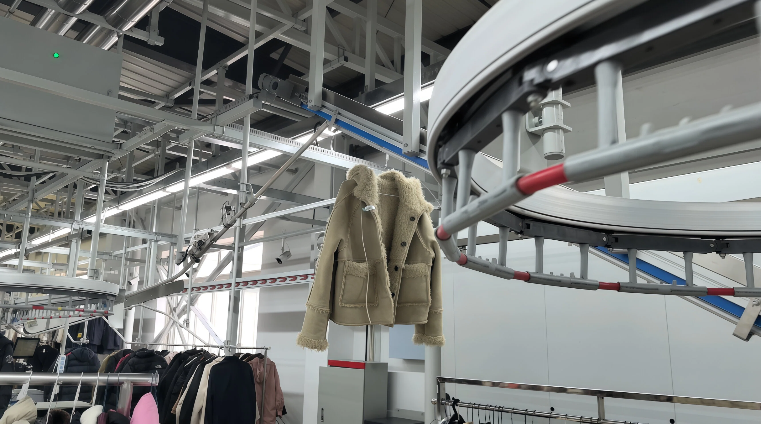 **硬件产品**:智能衣物集单分配系统经过 4 年研发,与工厂软件无缝对接,在一条输送线上实现门店批量一次分配与个人二次集单分配,全程无人化,解决工厂配单易出错、人工成本高难题。硬件规避钢带断裂、电机过载、衣物脱落、能耗高等问题,线体主副轨分离,主轨驱动、副轨承重,提升运行速度与稳定性。衣架采用无悬空无断点设计,防止变形与意外脱落。每组传动一钩一挂,衣物等距匀速输送,分配精准零失误,运行速度 0.67m/s,1.5 秒完成一件衣物分配。驱动采用分布式布局与同步轮设计,扭矩分配均匀,避免电机同步问题损坏设备,可灵活布局、90° 拐角、爬坡超 60°,安装拆卸及轨道维护便捷,传动无需润滑油,作业环境优良,基本无售后。动力与非动力线体均为铝合金材质,美观整洁,耐腐蚀且减轻框架承重。智能烘干房可智能控温控湿,无人工进入完成烘干,适配大批量烘干需求;旋转衣架采用碳钢静音设计,30mm 间距避免衣物挤压,单层双层吊挂适配不同空间,联动系统可快速找衣盘点;熨烫工位线可量身规划岗位动线,助力员工高效完成熨烫作业;无人值守收发系统支持自助投取、扫码打单,联动后端设备实现全流程自动化,打通工厂、收衣点与无人店。