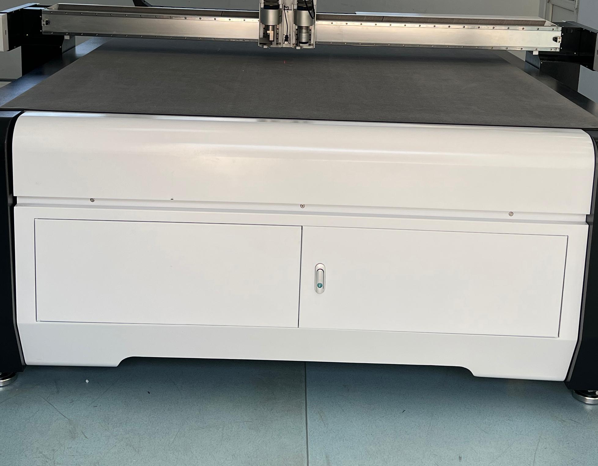 在性能方面,产品具有微米级切割精度,搭载CCD视觉定位系统+智能补偿算法,自动识别材料排版与边缘轮廓,切割精度可达±0.1mm;搭配高频振动刀头,裁切边缘光滑无毛刺、无焦边,无需二次修边处理。超高效率裁切,刀头振动频率可达18000次/分钟,配合全自动送料系统,裁切速度较传统设备提升50%以上;支持多层材料同步切割,大幅提升单位时间产能。一机多用全能裁切,集成智能切割、全切、半切、开槽、压痕、打孔四大功能,无需更换刀具即可完成多道工序;兼容碳纤维、PVC篷布、皮革、珍珠棉、碳纤维布、广告KT板等50余种非金属材料,覆盖广告、包装、汽车内饰、新材料、新能源等全行业需求。