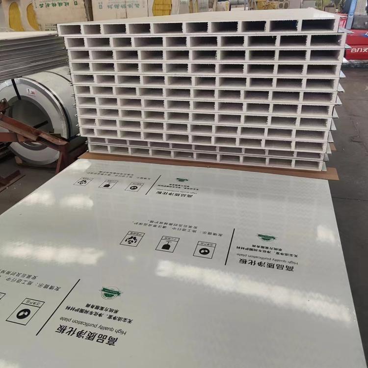 机制中空玻镁净化板以彩色涂层钢板为面材,以中空玻镁为芯材,用热固化胶在连续成型机内加压复合而成,性能稳定的镁质胶凝材料,以中碱性玻纤网为增强材质,以轻质材料为填充物复合而成的新型不燃性装饰材料。具有防火,防水,无味,无毒,不冻,不腐,不裂,不变,不燃,高强质轻等特点,可用于对环境要求较高的场所。