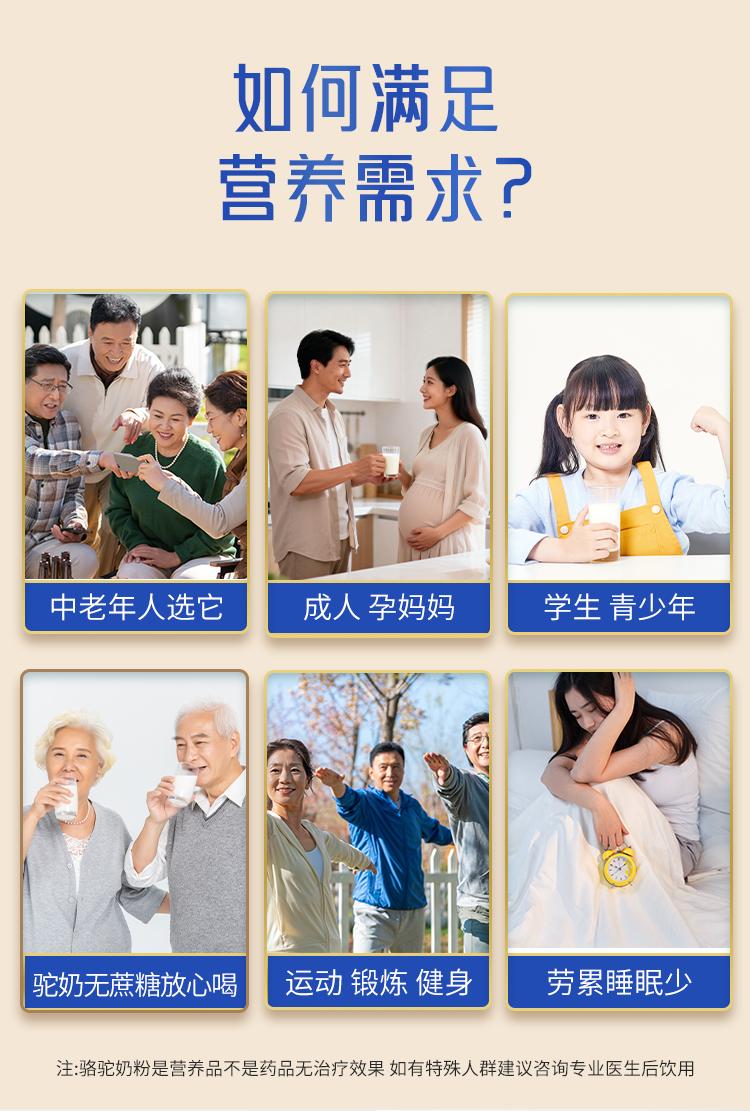 新疆中驼生物科技有限公司致力于为消费者提供安全、营养的驼乳制品。其核心受众广泛,涵盖了多个年龄段和不同需求的人群。首先是30 - 55岁关注养生健康,对生活品质有要求,可能为家人(老人、孩子)寻找更好营养补充的中产家庭核心成员。其次是28 - 45岁有社交礼赠需求,如送给长辈、领导、重要客户的人群。还有对“牧场 - 加工双有机认证”、“天山碱性荒漠牧场”、新疆“珍”驼奶、“产地品牌故事”等概念感兴趣,热衷探索高品质小众产品的人群。