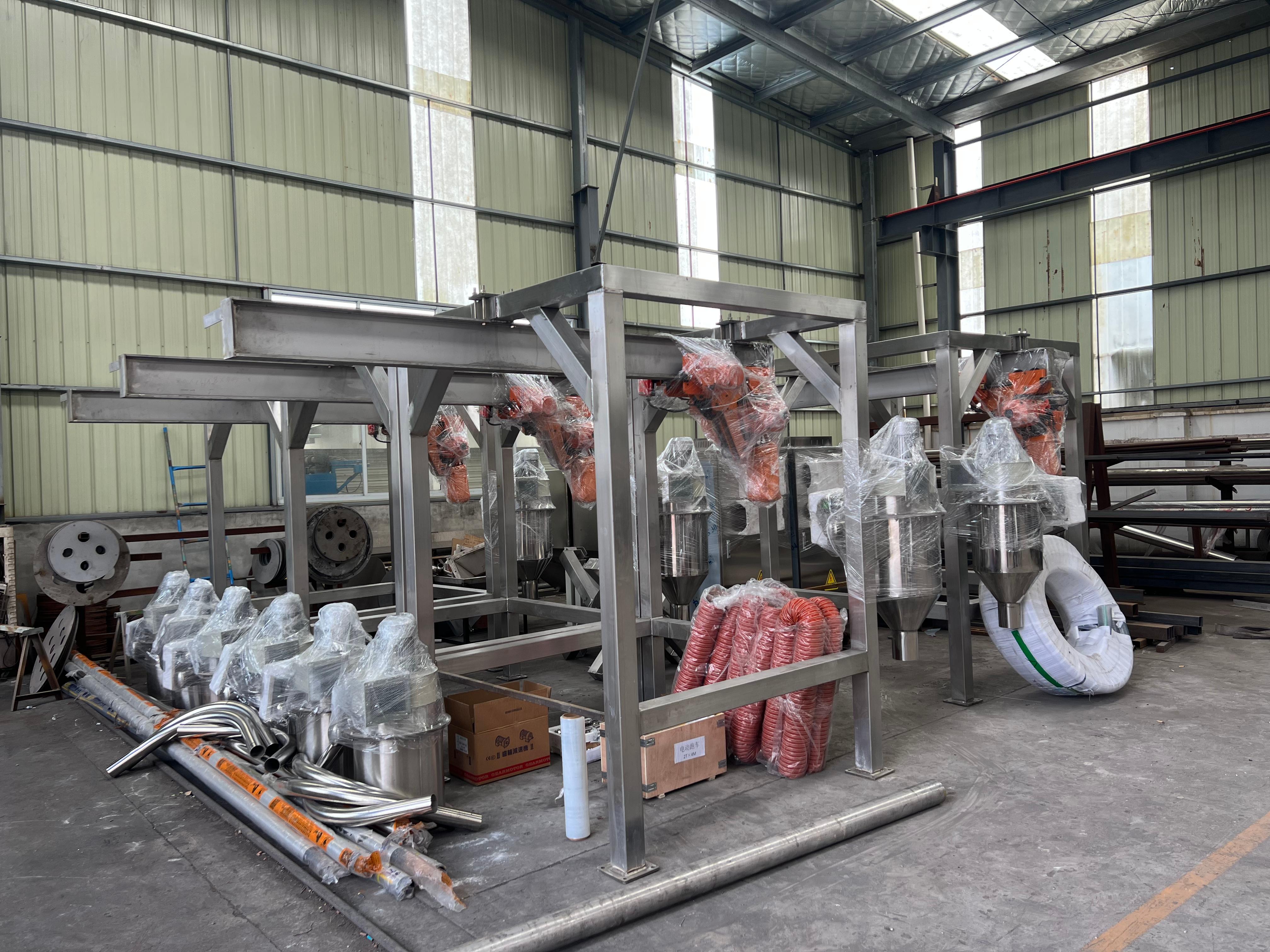 输送与供料性能也十分出色。真空/负压输送距离≤50m、高度≤15m,流量0.5 - 10m³/h,具有密闭无尘、无泄漏、无交叉污染的特点。集中供料系统支持多机台、多料仓、多配方自动切换,可24小时连续稳定运行,减少人工干预。上料/卸料方式多样,包括吨袋卸料、无尘投料、螺旋上料,适配大袋/小袋/料仓多种进料方式。