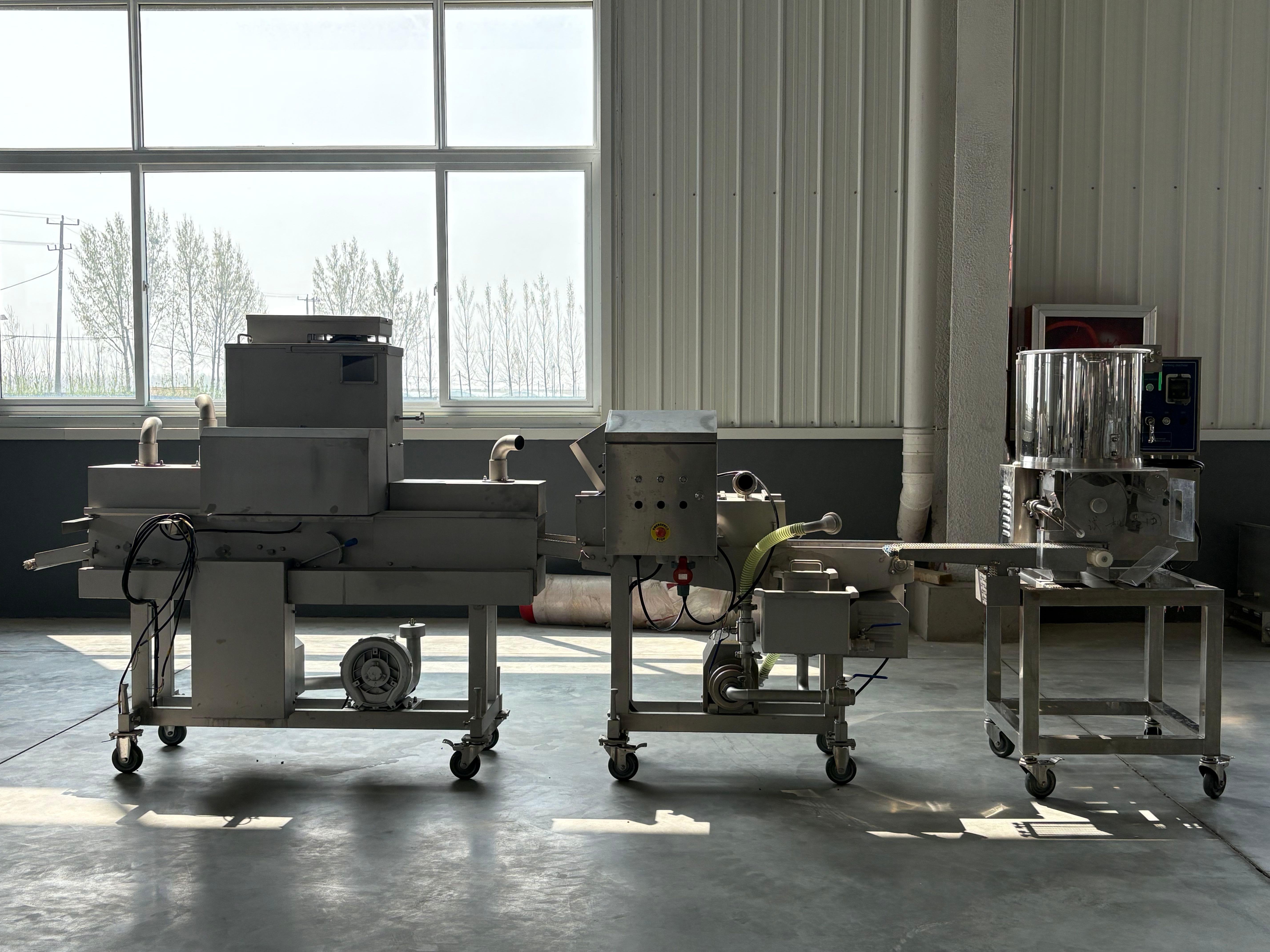 **肉饼裹浆机**:专门针对肉饼进行裹浆处理,确保肉饼在油炸或烹饪过程中保持水分,提升口感。该设备稳定性好,能够长时间连续工作。