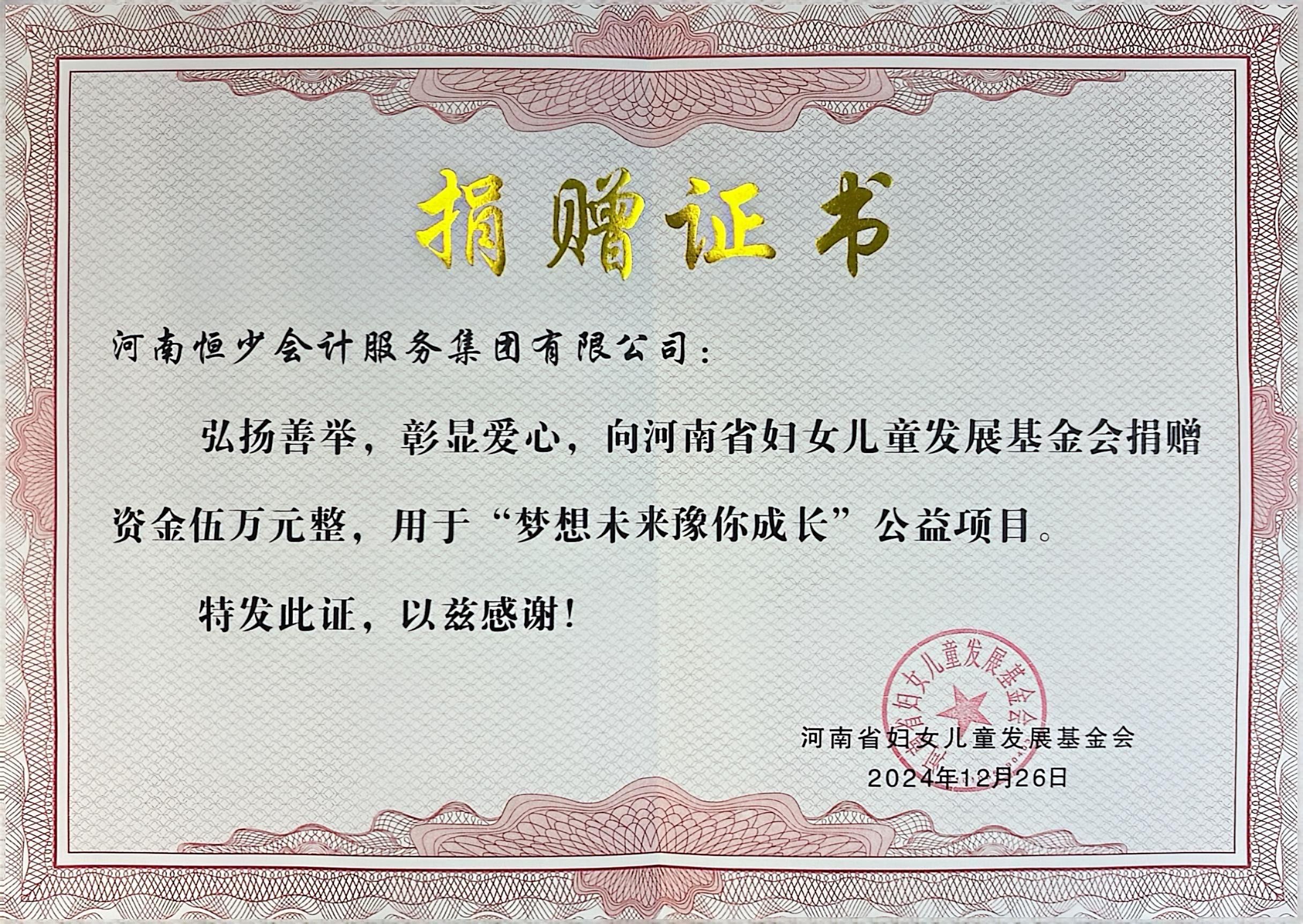 河南恒少会计服务集团有限公司的使命是“让每一位创业者梦想成真”,经营理念是“为客户提供更具有价值的服务”,价值观是“以服务客户至上,言必诚、实必信,简单真诚,追求卓越”,责任是“帮助每一位创业者实现财务无忧”,愿景是“立足与财务多元化,成立恒少商学院、恒少教育、恒少资本”,前景是“立足与河南郑州,面向全国,未来5年将覆盖全国主要省市,完成百城千店,10年内努力在新三板上市”。同时,公司也积极履行社会责任,获得了**与行业的认可。2024年12月向河南省妇女儿童发展**会捐赠5万元,用于“梦想未来豫你成长”公益项目;2025年1月向河南省妇女儿童发展**会捐赠价值259150元的教室护眼灯具;2025年7月榕江遭遇特大洪灾,为受灾群众送去温暖与希望,捐赠2万元;2025年12月成立中共河南恒少会计服务集团党支部。