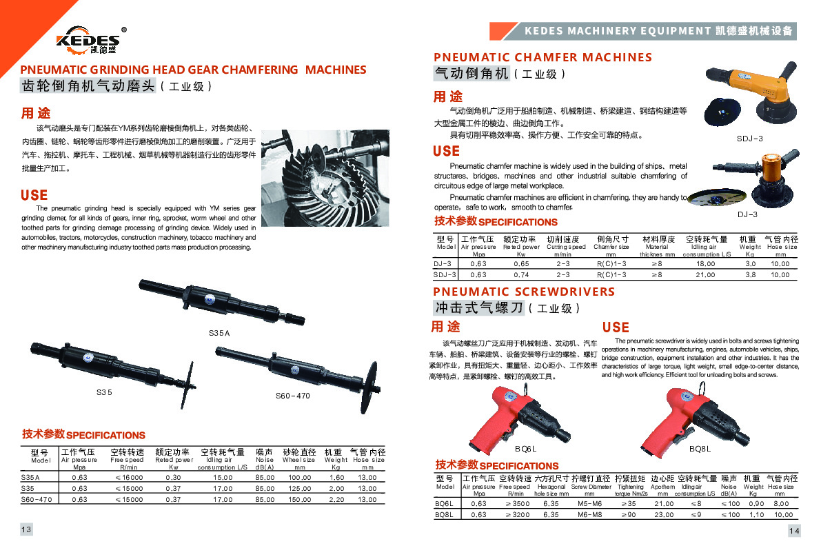气动角向磨光机(SJ100、SJ125B等)砂轮直径85 - 300mm,功率0.60 - 2.20Kw,主要用于金属除锈、焊缝除渣。在金属加工和焊接过程中,金属表面会生锈,焊缝处也会有焊渣,气动角向磨光机能够轻松解决这些问题,使金属表面更加光滑,焊缝更加美观。