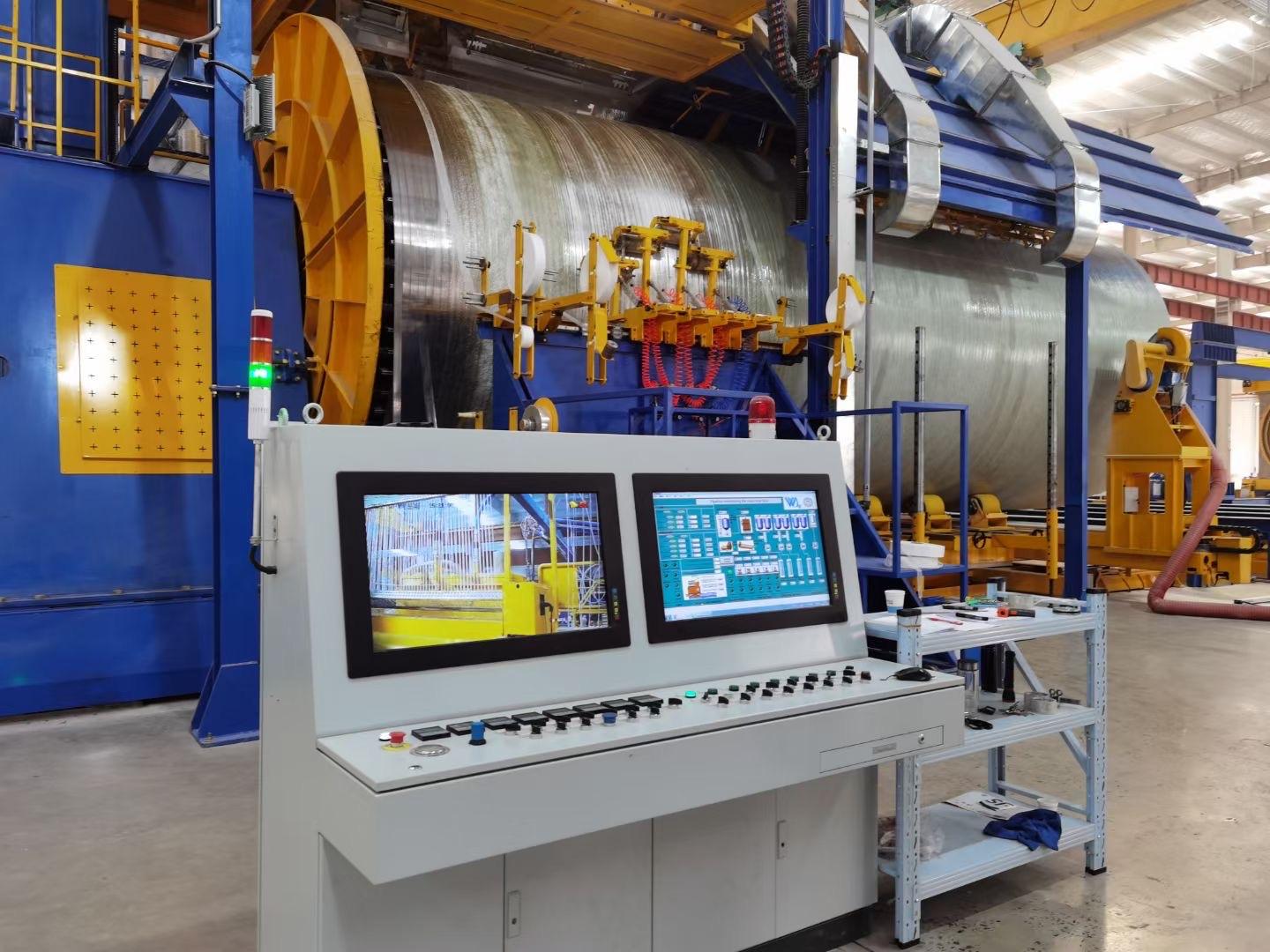 其连续缠绕玻璃钢管道生产线由缠绕主机、智能供料系统、自动转运系统、接头制作系统、质保体系及环保处理系统构成综合体统。通过计算机控制纤维、石英砂、树脂、助剂等材料精准投放于钢带模具表面,配合远红外高效固化技术,结合增材制造工艺,打造出叠层、密实、均质结构。在产品质量、生产效率、机械性能、减轻工人的工作强度、工作环境等方面显著优于传统工艺。