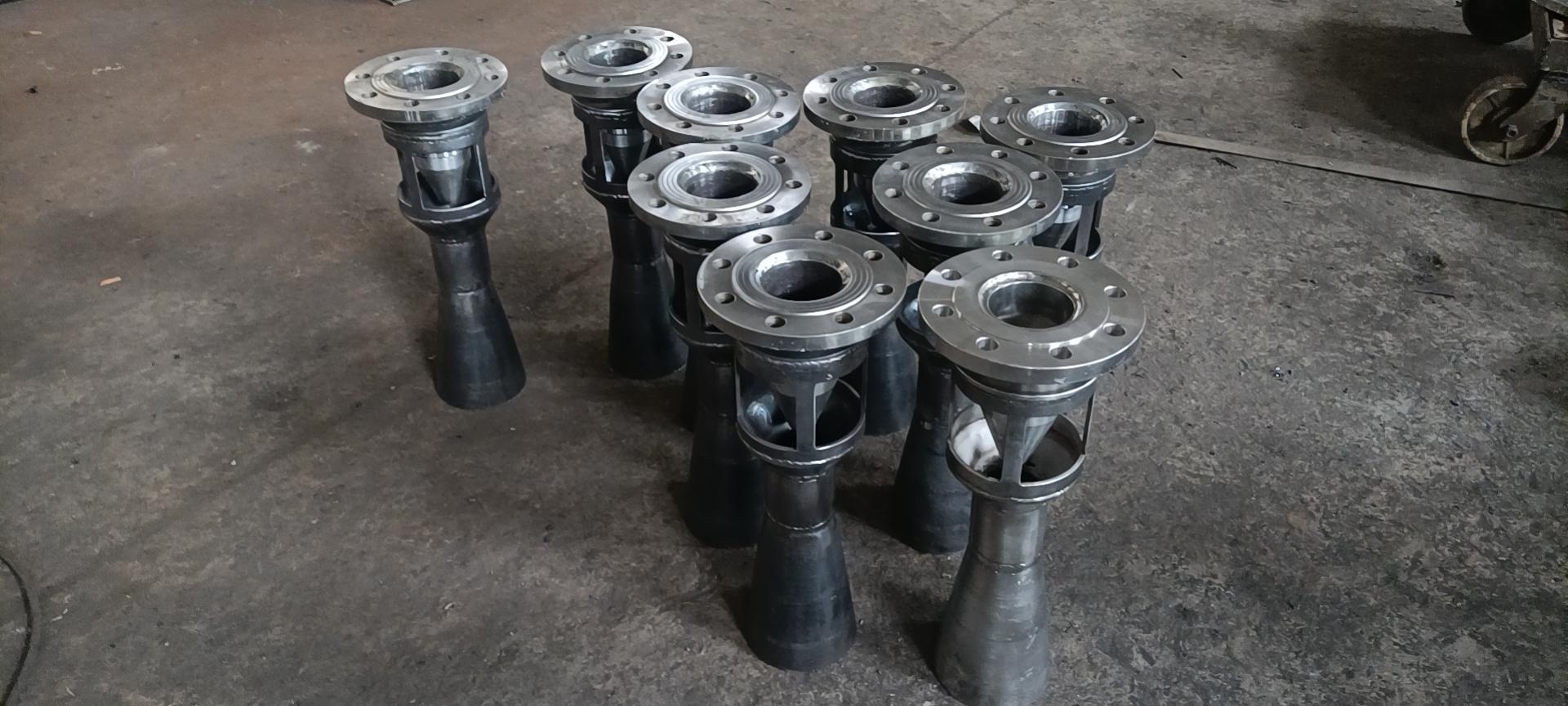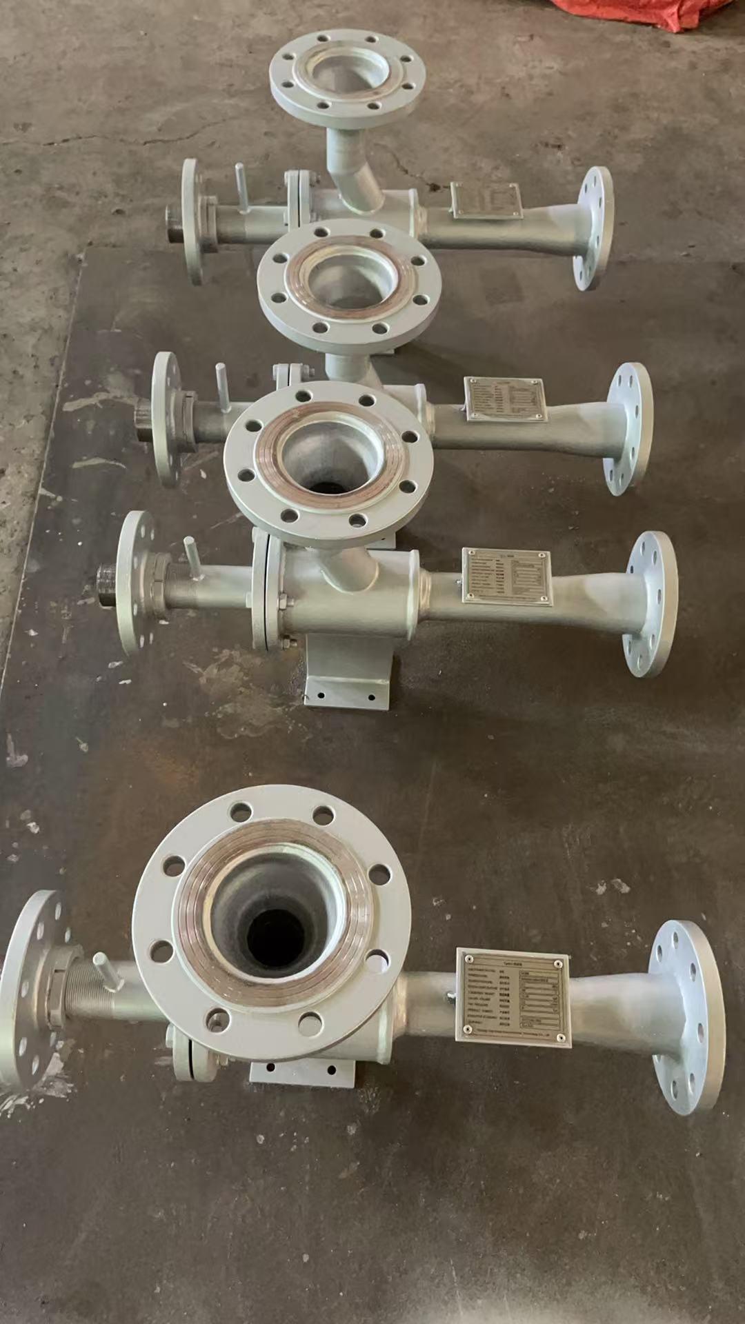 液硫池喷射器也是该厂的主营产品之一,主要用于硫磺回收工艺中。它通过喷射器将液硫池液面上方的废气抽出并送到制硫燃烧炉,液硫储槽中安装有鼓泡器。抽空器引入气体大部份是空气,含有少量的H2S、SO2等气体。液硫池喷射器一般要求为整体全夹套结构,吸入口和出口为非标大小法兰结构。