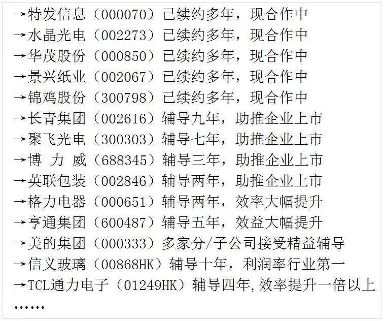 该公司的客户众多,包括美的、格力、TCL、首钢集团、中粮集团等数千家实体企业,覆盖钢铁、汽车、家具、化工、纺织、电子电器、装备制造、五金建材、光电、能源电池、电梯、造纸、制衣制鞋、医药器械、煤炭、食品饮料等多个行业。客户对其评价颇高,例如海伦哲股份董事长丁剑平表示与该公司合作六年,工厂管理水平大幅提升,德日同行均予认可;水晶光电董事长林敏认为该公司快速见效的关键是重视对人的研究与激发等。