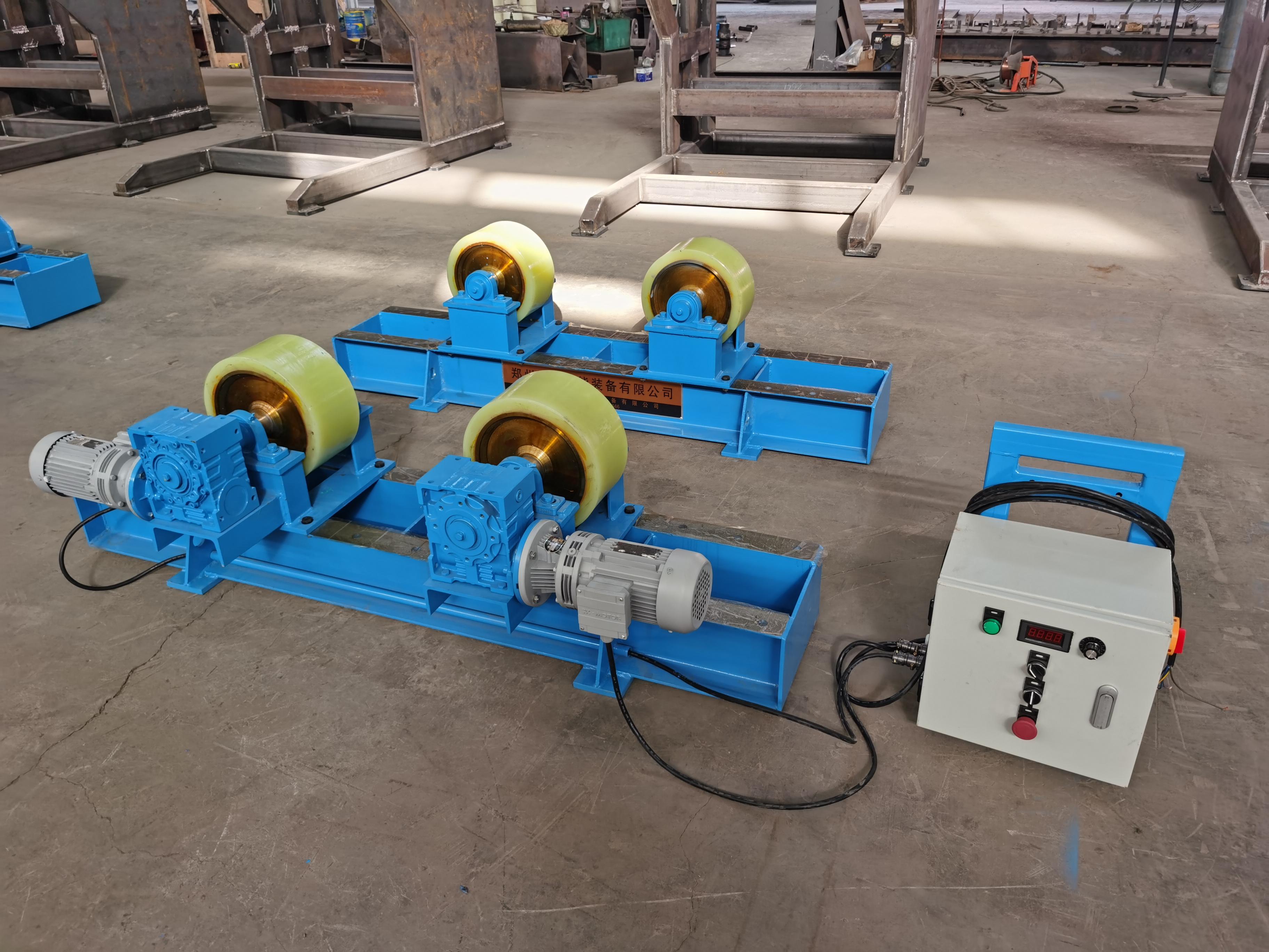 首先来介绍一下焊接滚轮架。该公司的焊接滚轮架分为自调滚轮架和可调滚轮架。自调滚轮架具有自动对中功能,无需人工调整滚轮间距,可自适应不同直径的圆柱形工件,能快速完成工件装夹,装夹效率相比传统方式提升了 60%。其采用钢制滚轮 + 聚氨酯包胶,耐磨耐压,可适配厚壁压力容器、风电塔筒等重型工件的焊接 / 抛光工序。可调滚轮架的滚轮中心距可手动 / 电动调节,能适配异形工件、非标准直径工件的支撑与转动,还可与操作机、变位机联动,实现工件的焊接、切割、检测一体化作业,覆盖工程机械、石化装备、压力容器、锅炉等多行业。